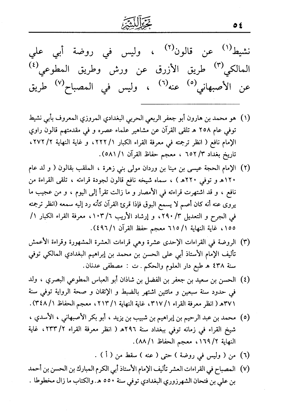 (¬1) هو محمد بن هارون أبو جعفر الربعي الحربي البغدادي المروزي المعروف بأبي نشيط توفي عام 258 هـ تلقى القرآن عن مشاهير علماء عصره وفي مقدمتهم قالون راوي الإمام نافع (انظر ترجمته في معرفة القراء الكبار 1/ 222، وغاية النهاية 2/ 272، تاريخ بغداد 3/ 652، معجم حفاظ القرآن 1/ 581).