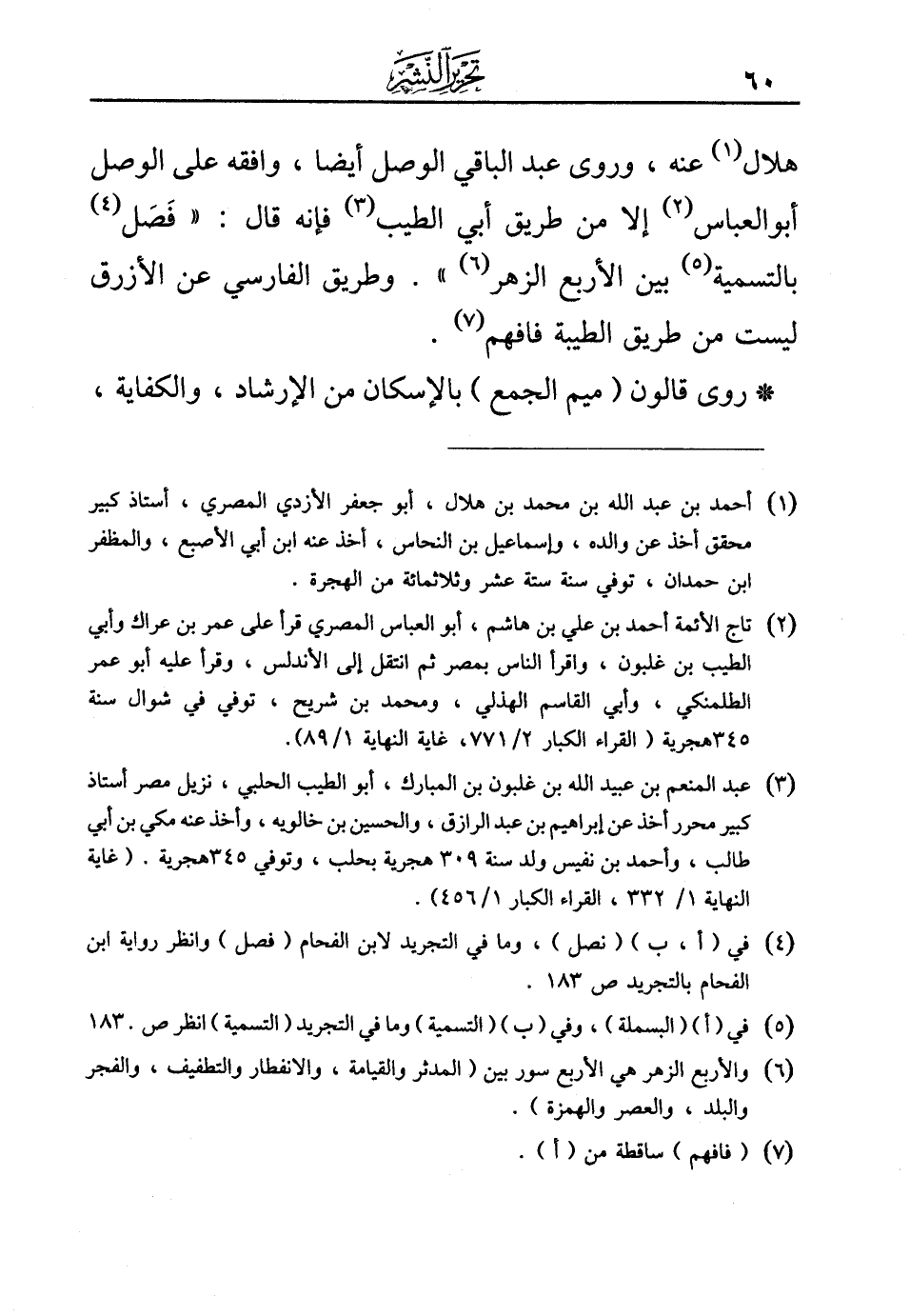 (¬3) عبد المنعم بن عبيد الله بن غلبون بن المبارك، أبو الطيب الحلبي، نزيل مصر أستاذ كبير محرر أخذ عن إبراهيم بن عبد الرازق، والحسين بن خالويه، وأخذ عنه مكي بن أبي طالب، وأحمد بن نفيس ولد سنة 309 هجرية بحلب، وتوفي 345 هجرية. (غاية النهاية 1/ 332، القراء الكبار 1/ 456).