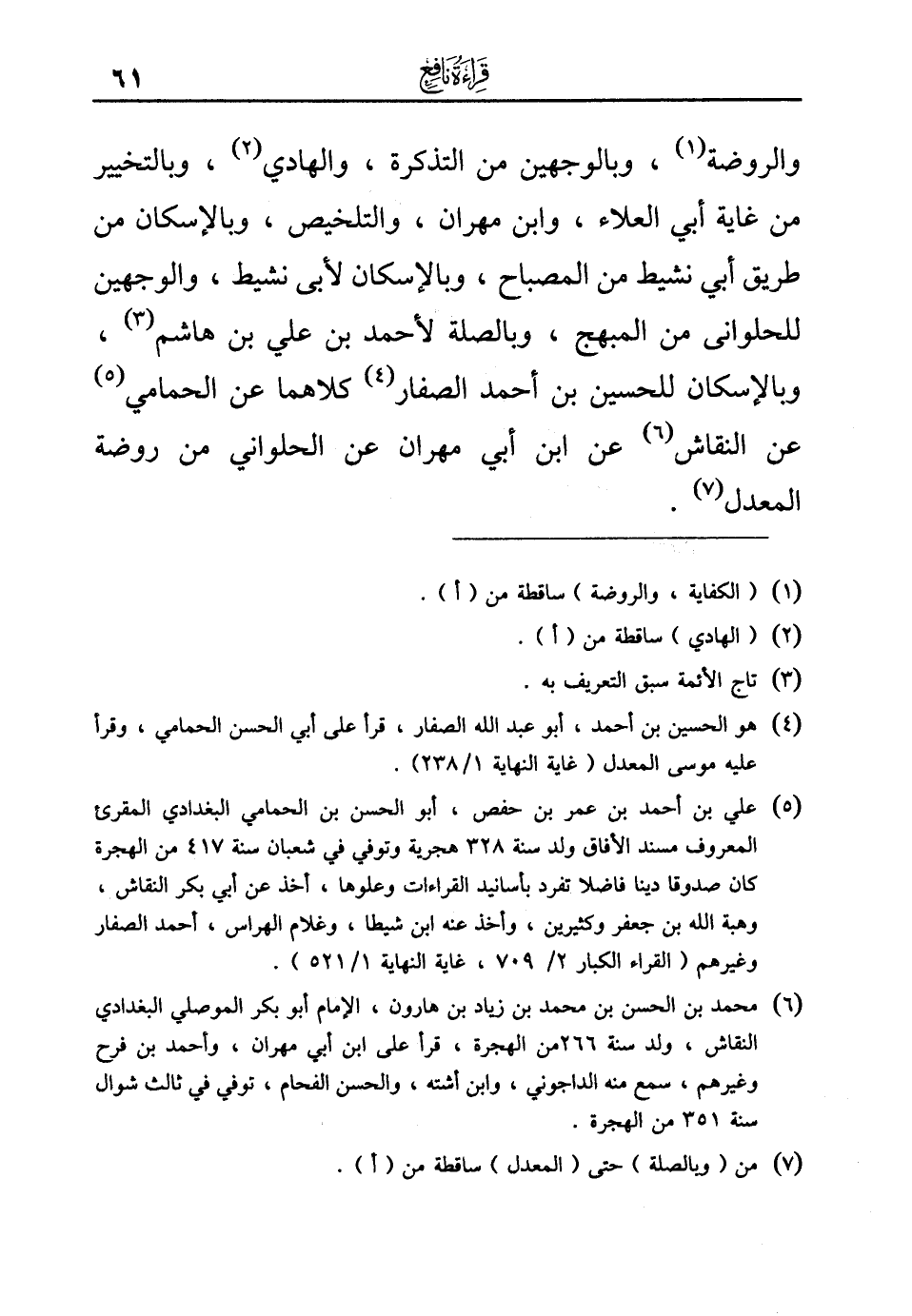 (¬4) هو الحسين بن أحمد، أبو عبد الله الصفار، قرأ على أبي الحسن الحمامي، وقرأ عليه موسى المعدل (غاية النهاية 1/ 238).