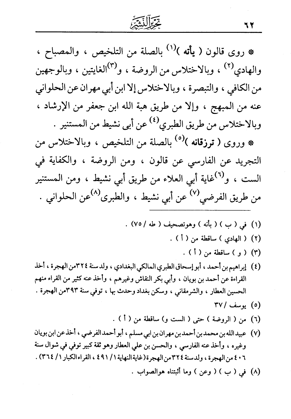 (¬4) إبراهيم بن أحمد، أبو إسحاق الطبري المالكي البغدادي، ولد سنة 324 من الهجرة، أخذ القراءة عن أحمد بن بويان، وأبي بكر النقاش وغيرهم، وأخذ عنه كثير من القراء منهم الحسين العطار، والشرمقاني، وسكن بغداد وحدث بها، توفي سنة 393 من الهجرة.
