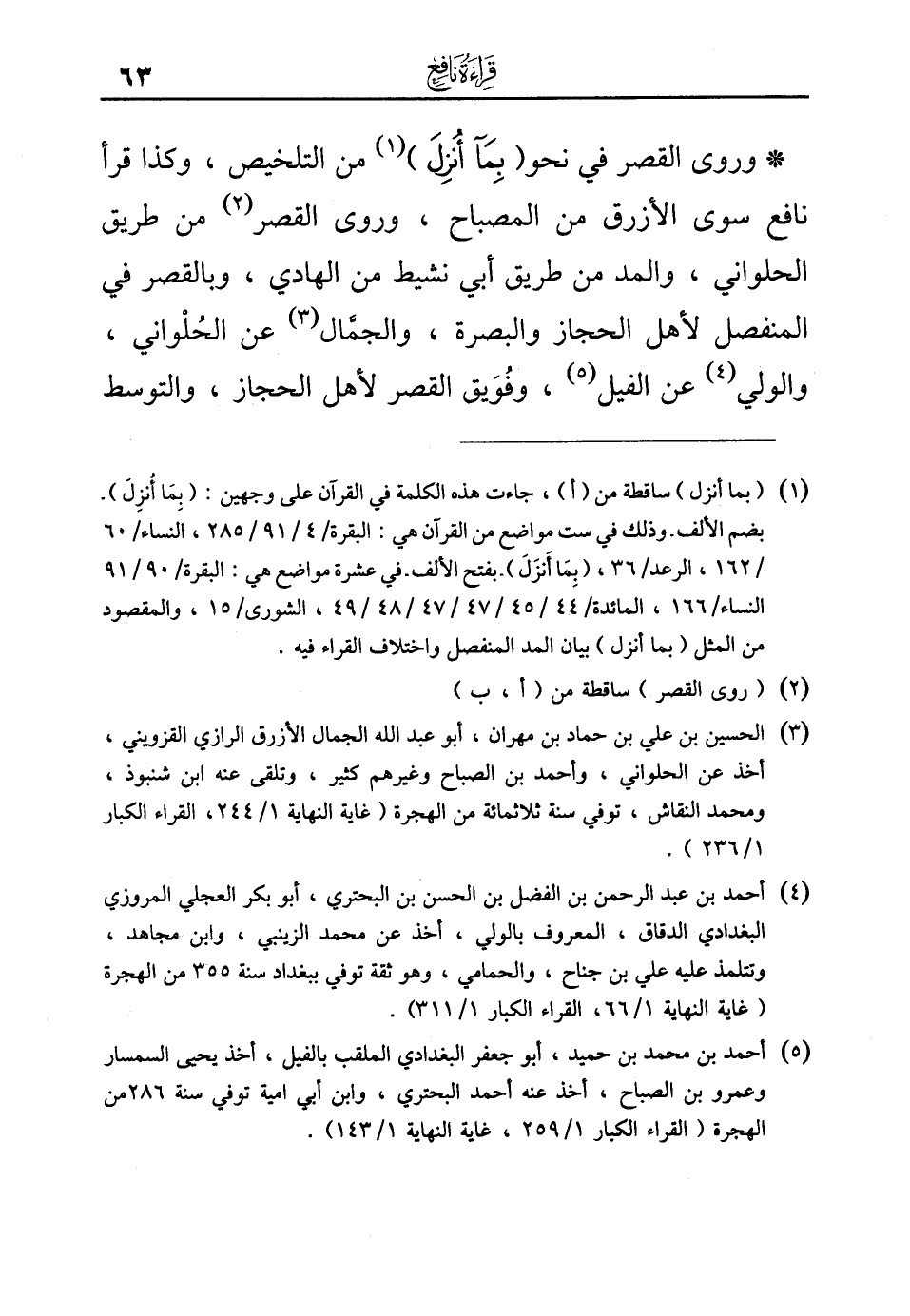 * وروى القصر في نحو (بما أنزل) (¬1) من التلخيص، وكذا قرأ نافع سوى الأزرق من المصباح، وروى القصر (¬2) من طريق الحلواني، والمد من طريق أبي نشيط من الهادي، وبالقصر في المنفصل لأهل الحجاز والبصرة، والجمّال (¬3) عن الحلواني، والولي (¬4) عن الفيل (¬5)، وفويق القصر لأهل الحجاز، والتوسط