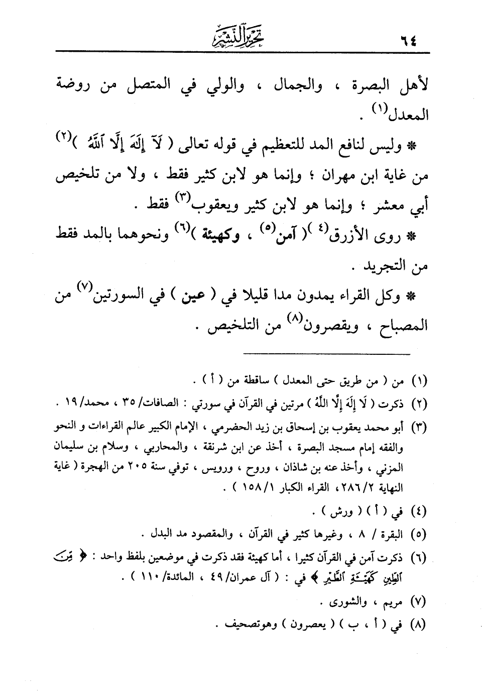 *وليس لنافع المد للتعظيم في قوله تعالى (لآ إله إلاّ الله) (¬2) من غاية ابن مهران؛ وإنما هو لابن كثير فقط، ولا من تلخيص أبي معشر؛ وإنما هو لابن كثير ويعقوب (¬3) فقط.