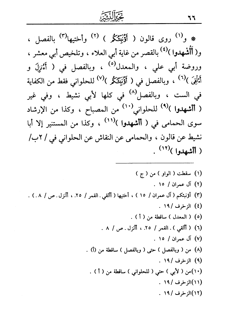 * و (¬1) روى قالون (أؤنبّئكم) (¬2) وأختيها (¬3) بالفصل، و (أأشهدوا) (¬4) بالقصر من غاية أبي العلاء، وتلخيص أبي معشر، وروضة أبي علي، والمعدل (¬5)، وبالفصل في ({أَأُنْزِلَ} و {أَأُلْقِيَ)} (¬6)، وبالفصل في {(أَأُنَبِّئُكُمْ)} (¬7) للحلواني فقط من الكفاية في الست، وبالفصل (¬8) في كلها لأبي نشيط، وفي غير (أأشهدوا) (¬9) للحلواني (¬10) من المصباح، وكذا من الإرشاد سوى الحمامى في (أأشهدوا) (¬11)، وكذا من المستنير إلا أبا نشيط عن قالون، والحمامى عن النقاش عن الحلواني في/2 ب/ (أأشهدوا) (¬12).