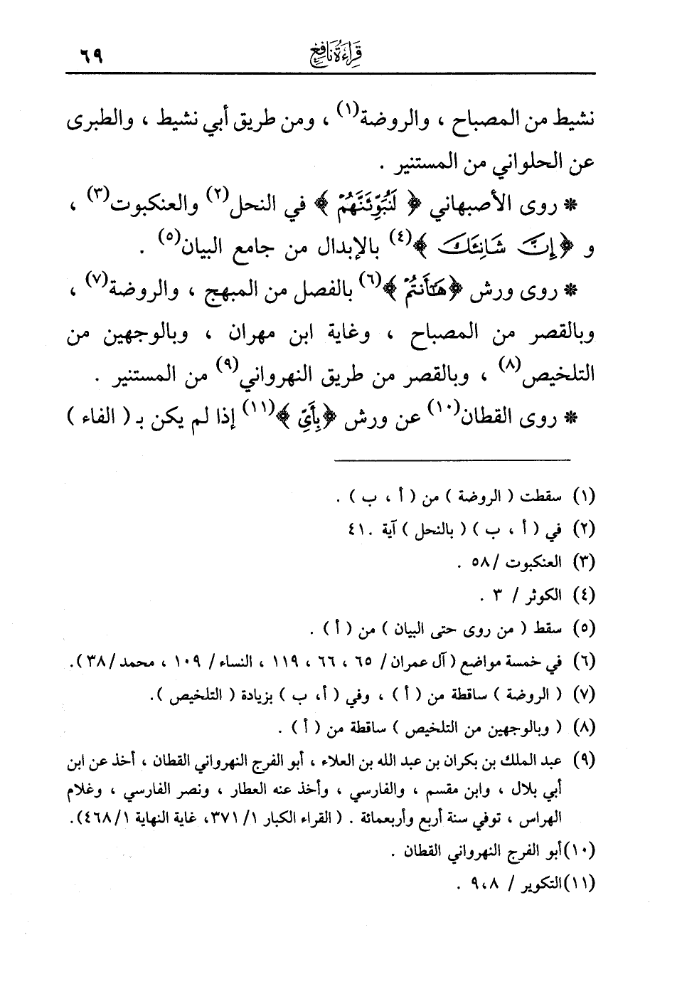 (¬9) عبد الملك بن بكران بن عبد الله بن العلاء، أبو الفرج النهرواني القطان، أخذ عن ابن أبي بلال، وابن مقسم، والفارسي، وأخذ عنه العطار، ونصر الفارسي، وغلام الهراس، توفي سنة أربع وأربعمائة. (القراء الكبار 1/ 371، غاية النهاية 1/ 468).