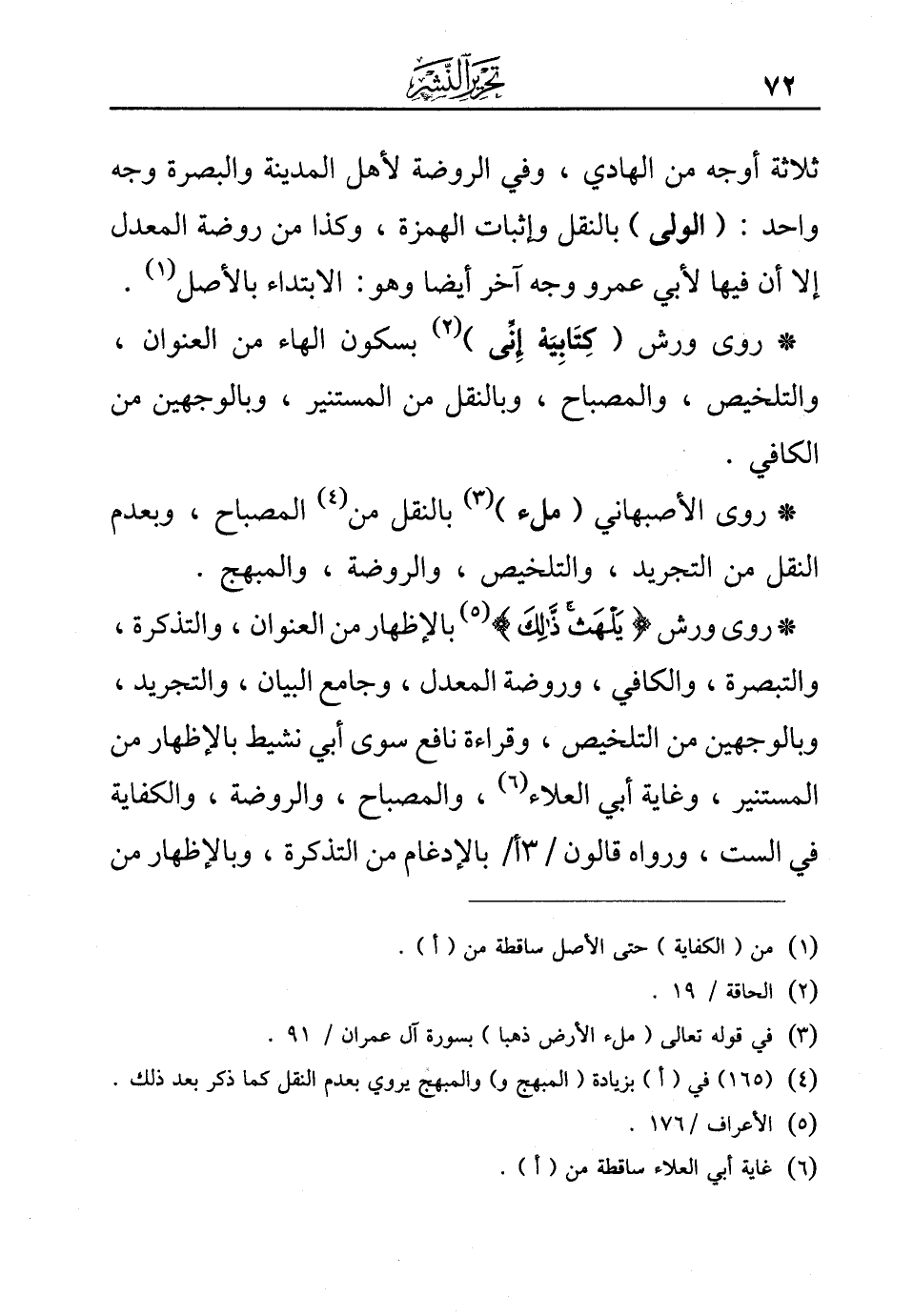 * روى ورش {(كِتابِيَهْ إِنِّي)} (¬2) بسكون الهاء من العنوان، والتلخيص، والمصباح، وبالنقل من المستنير، وبالوجهين من الكافي.