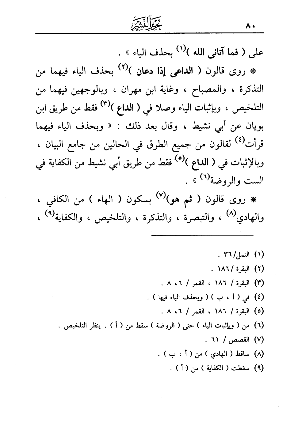 * روى قالون (الداعى إذا دعان) (¬2) بحذف الياء فيهما من التذكرة، والمصباح، وغاية ابن مهران، وبالوجهين فيهما من التلخيص، وبإثبات الياء وصلا في {(الدّاعِ)} (¬3) فقط من طريق ابن بويان عن أبي نشيط، وقال بعد ذلك: «وبحذف الياء فيهما قرأت (¬4) لقالون من جميع الطرق في الحالين من جامع البيان، وبالإثبات في {(الدّاعِ)} (¬5) فقط من طريق أبي نشيط من الكفاية في الست والروضة (¬6)».