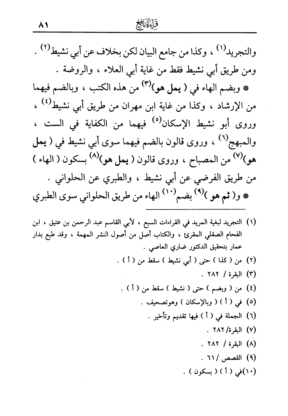 (¬1) التجريد لبغية المريد في القراءات السبع، لأبي القاسم عبد الرحمن بن عتيق، ابن الفحام الصقلي المقرئ، والكتاب أصل من أصول النشر المهمة، وقد طبع بدار عمار بتحقيق الدكتور ضاري العاصي.