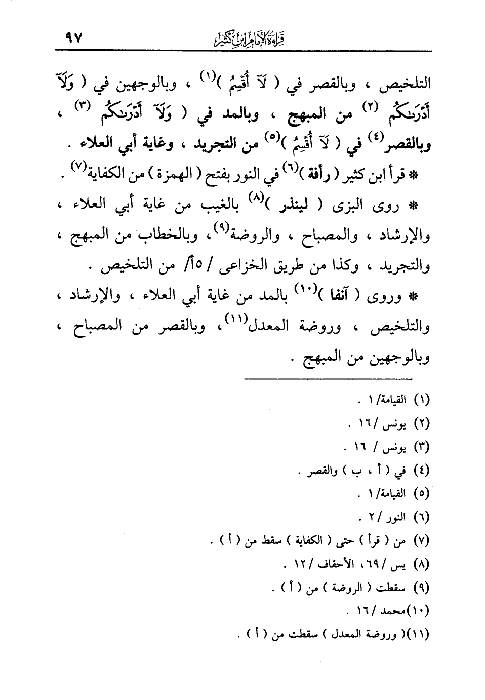 التلخيص، وبالقصر في {(لا أُقْسِمُ)} (¬1)، وبالوجهين في ({وَلا أَدْراكُمْ} (¬2) من المبهج، وبالمد في (ولا أدرئكم (¬3)، وبالقصر (¬4) في {(لا أُقْسِمُ)} (¬5) من التجريد، وغاية أبي العلاء.