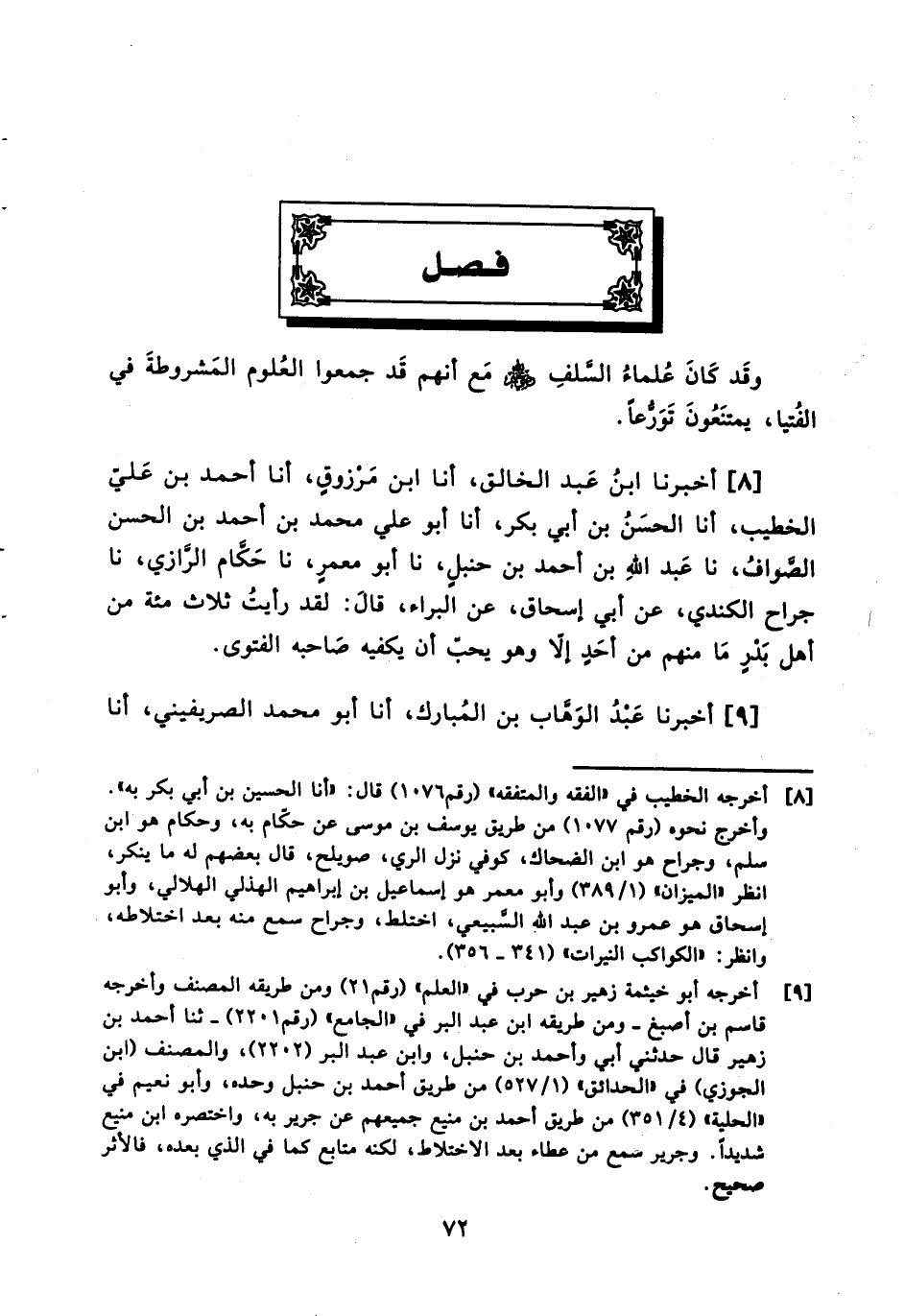 ٨- أخبرنا ابن عبد الخالق، أنا ابن مرزوقٍ، أنا أحمد بن علي الخطيب، أنا الحسن بن أبي بكر، أنا أبو علي محمد بن أحمد بن الحسن الصواف، نا عبد الله بن أحمد بن حنبلٍ، نا أبو معمرٍ، نا حكام الرازي، نا جراح الكندي، عن أبي إسحاق، عن البراء، قال: لقد رأيت ثلاث مئة من أهل بدرٍ ما منهم من أحدٍ إلا وهو يحب أن يكفيه صاحبه الفتوى.