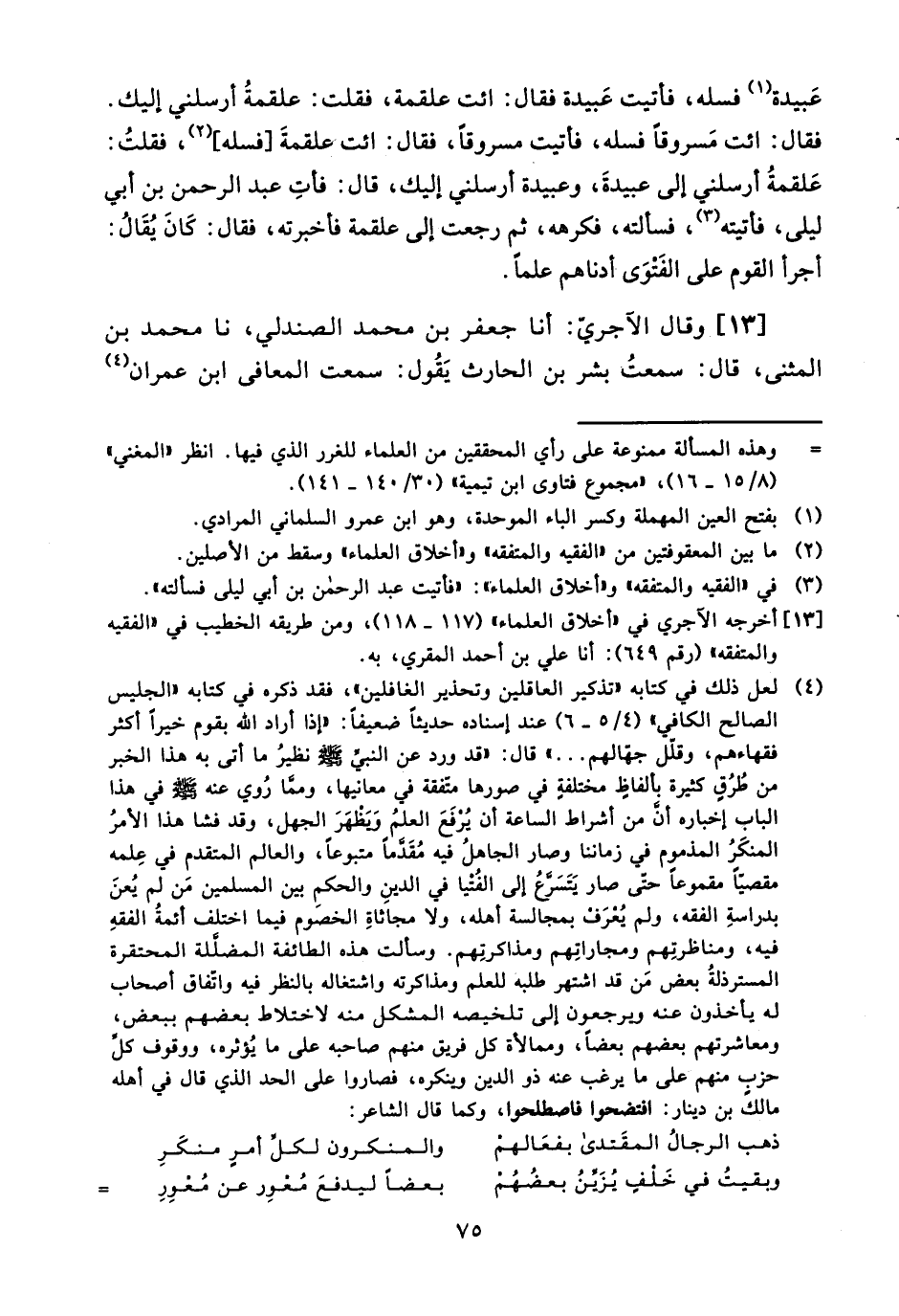 ١٣- وقال الآجري: أنا جعفر بن محمد الصندلي، نا محمد بن المثنى، قال: سمعت بشر بن الحارث يقول: سمعت المعافى بن عمران ⦗٧٦⦘ يذكر عن سفيان، قال: أدركت الفقهاء وهم يكرهون أن يجيبوا في المسائل والفتيا [ولا يفتون] حتى لا يجدوا بدًّا من أن يفتوا، وقال المعافى: قال سفيان: أدركت [الناس ممن أدركت من] العلماء والفقهاء [وهم] يترادون المسائل يكرهون أن يجيبوا فيها، فإذا أعفوا [منها] كان [ذلك] أحب إليهم.