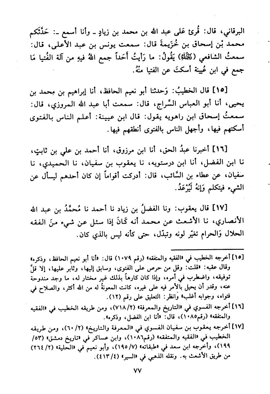 ١٥- قال الخطيب: وحدثنا أبو نعيم الحافظ، أنا إبراهيم بن محمد بن يحيى، أنا أبو العباس السراج، قال: سمعت أبا عبد الله المروزي، قال: سمعت إسحاق ابن راهويه يقول: قال ابن عيينة: أعلم الناس بالفتوى أسكتهم فيها، وأجهل الناس بالفتوى أنطقهم فيها.