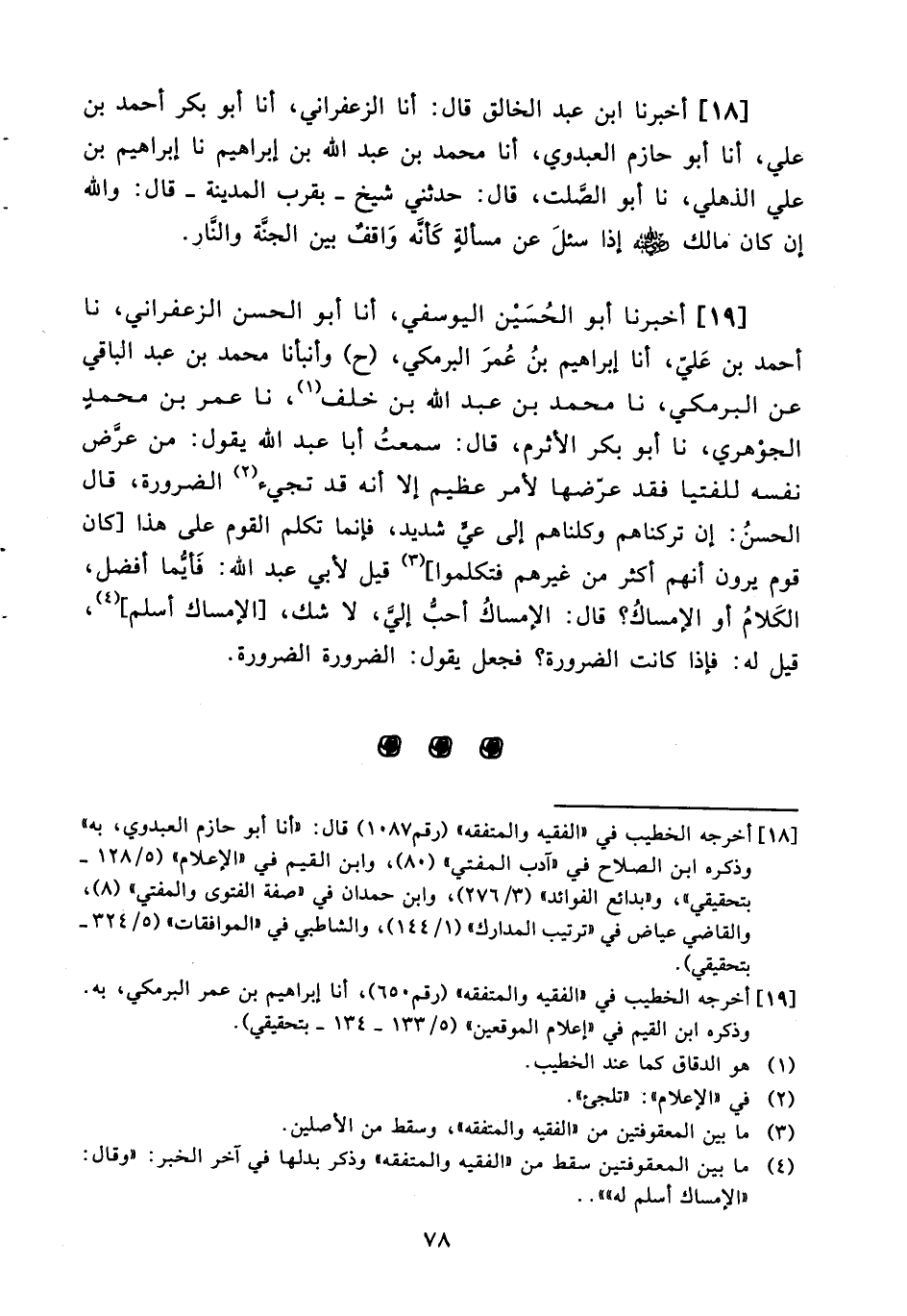 ١٩- أخبرنا أبو الحسين اليوسفي، أنا أبو الحسن الزعفراني، نا أحمد بن علي، أنا إبراهيم بن عمر البرمكي، (ح) وأنبأنا محمد بن عبد الباقي عن البرمكي، نا محمد بن عبد الله بن خلف، نا عمر بن محمدٍ الجوهري، نا أبو بكر الأثرم، قال: سمعت أبا عبد الله يقول: من عرض نفسه للفتيا فقد عرضها لأمر عظيم إلا أنه قد تجيء الضرورة، قال الحسن: إن تركناهم وكلناهم إلى عي شديد، فإنما تكلم القوم على هذا [كان قوم يرون أنهم أكثر من غيرهم فتكلموا] قيل لأبي عبد الله: فأيما أفضل، الكلام أو الإمساك؟ قال: الإمساك أحب إلي، لا شك، [الإمساك أسلم] قيل له: فإذا كانت الضرورة؟ فجعل يقول: الضرورة الضرورة.