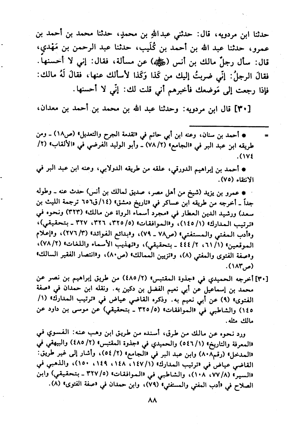 ٣٠- قال ابن مردويه: وحدثنا عبد الله بن محمد بن أحمد بن معدان: ⦗٨٩⦘ حدثنا محمد بن مسلم بن وارة، قال: سمعت أبا نعيم يقول: ما رأيت عالما ًقط أكثر قولاً لا أدري من مالك بن أنسٍ (رضي الله عنه) .