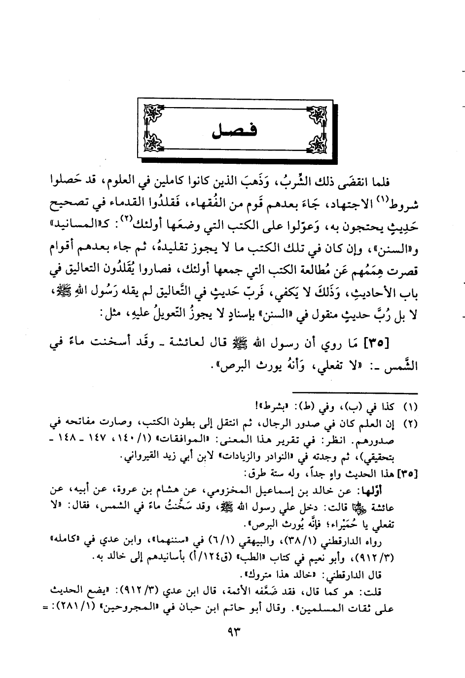 ٣٥- ما روي أن رسول الله صلى الله عليه وسلم قال لعائشة -وقد أسخنت ماءً في الشمس- ((لا تفعلي، وأنه يورث البرص)) .