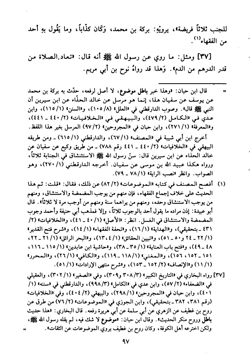 ٣٧- ومثل: ما روي عن رسول الله صلى الله عليه وسلم أنه قال: ((تعاد الصلاة من قدر الدرهم من الدم)) . وهذا قد رواه نوح بن أبي مريم.