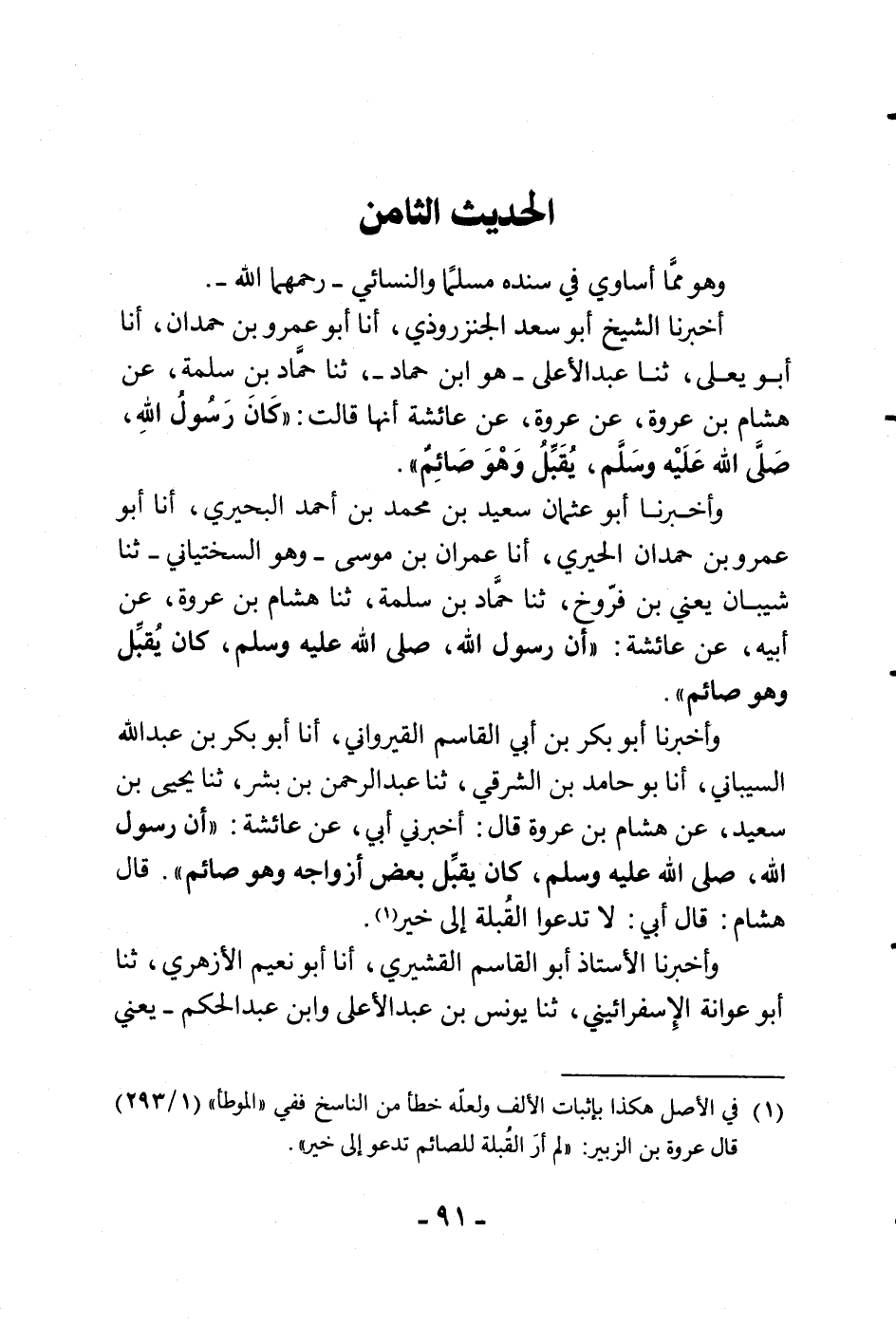وَأَخْبَرَنَا أَبُو عُثْمَانَ سَعِيدُ بْنُ مُحَمَّدِ بْنِ أَحْمَدَ الْبَحِيرِيُّ، أَنَا أَبُو عَمْرِو بْنُ حَمْدَانَ الْحِيرِيُّ، أَنَا عِمْرَانُ بْنُ مُوسَى وَهُوَ السَّخْتِيَانِيُّ، ثَنَا شَيْبَانُ يَعْنِي بْنَ فَرُّوخٍ، ثَنَا حَمَّادُ بْنُ سَلَمَةَ، ثَنَا هِشَامُ بْنُ عُرْوَةَ، عَنْ أَبِيهِ، عَنْ عَائِشَةَ: «أَنَّ رَسُولَ اللَّهِ صَلَّى اللَّهُ عَلَيْهِ وَسَلَّمَ يُقَبِّلُ وَهُوَ صَائِمٌ»