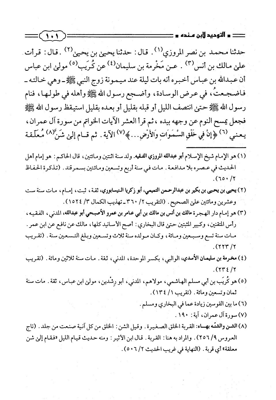 حدثنا محمد بن نصر المروزى (¬١). قال: حدثنا يحيى بن يحيى (¬٢). قال: قرأت على مالك بن أنس (¬٣). عن مَخْرمة بن سليمان (¬٤) عن كُرَيب (¬٥) مولى ابن عباس أن عبد الله بن عباس أخبره أنه بات ليلة عند ميمونة زوج النبى صلّى الله عليه وسلم - وهى خالته - فاضجعتُ، فى عرض الوسادة، وأضجع رسول الله صلّى الله عليه وسلم وأهله فى طولها، فنام رسول الله صلّى الله عليه وسلم حتى انتصف الليل أو قبله بقليل أو بعده بقليل استيقظ رسول الله صلّى الله عليه وسلم فجعل يمسح النوم عن وجهه بيده، ثم قرأ العشر الآيات الخواتم من سورة آل عمران، يعنى (¬٦) {إِنَّ فِي خَلْقِ السَّماواتِ وَالْأَرْضِ .. }. (¬٧) الآية. ثم قام إلى شَنّ (¬٨) مُعَلّقة