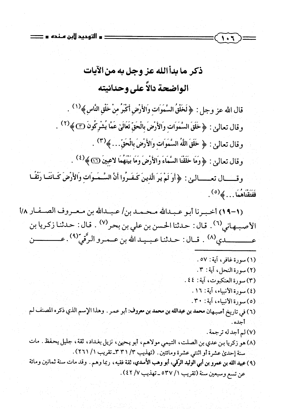 (١ - ١٩) أخبرنا أبو عبد الله محمد بن/عبدالله بن معروف الصفار الأصبهانى (¬٦). قال: حدثنا الحسن بن على بن بحر (¬٧). قال: حدثنا زكريا بن عبدى (¬٨). قال: حدثنا عبيد الله بن عمرو الرَّقىّ (¬٩). عن