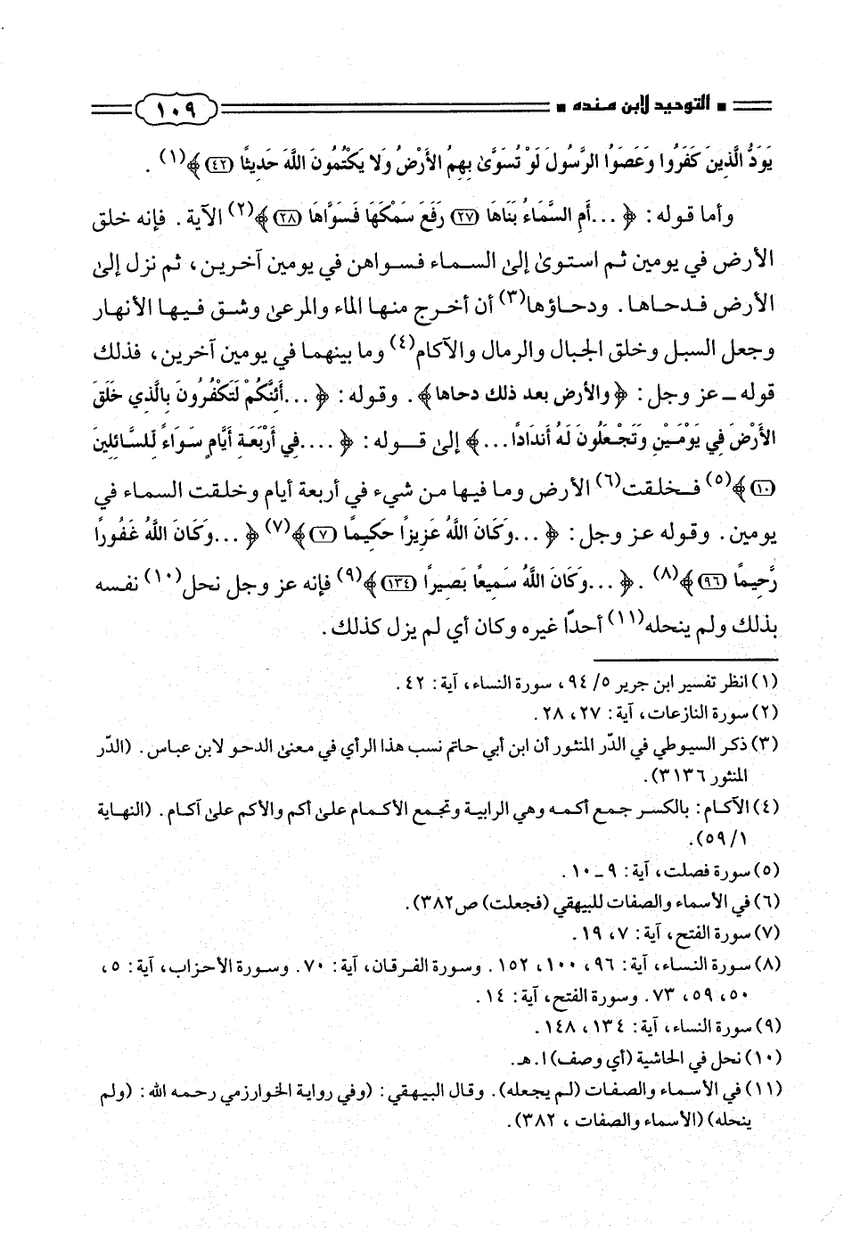 وأما قوله: { ... أَمِ السَّماءُ بَناها (٢٧) رَفَعَ سَمْكَها فَسَوّاها (٢٨)} (¬٢) الآية. فإنه خلق الأرض فى يومين ثم استوى إلى السماء فسواهن فى يومين آخرين، ثم نزل إلى الأرض فدحاها - ودحاؤها (¬٣) أن أخرج منها الماء والمرعى وشق فيها الأنهار وجعل السبل وخلق الجبال والرمال والآكام (¬٤) وما بينهما فى يومين آخرين، فذلك قوله - عز وجل: {وَالْأَرْضَ بَعْدَ ذلِكَ دَحاها}. وقوله: { ... أَإِنَّكُمْ لَتَكْفُرُونَ بِالَّذِي خَلَقَ الْأَرْضَ فِي يَوْمَيْنِ وَتَجْعَلُونَ لَهُ أَنْداداً .. }. إلى قوله: { .... فِي أَرْبَعَةِ أَيّامٍ سَواءً لِلسّائِلِينَ (١٠)} (¬٥) فخلقت (¬٦) الأرض وما فيها من شئ فى أربعة أيام وخلقت السماء فى يومين. وقوله عز وجل: { ... وَكانَ اللهُ عَزِيزاً حَكِيماً (٧)} (¬٧) { ... وَكانَ اللهُ غَفُوراً رَحِيماً (٩٦)} (¬٨). { .. وَكانَ اللهُ سَمِيعاً بَصِيراً (١٣٤)} (¬٩) فإنه عز وجل نحل (¬١٠) نفسه بذلك ولم ينحله (¬١١) احداً غيره وكان أى لم يزل كذلك.