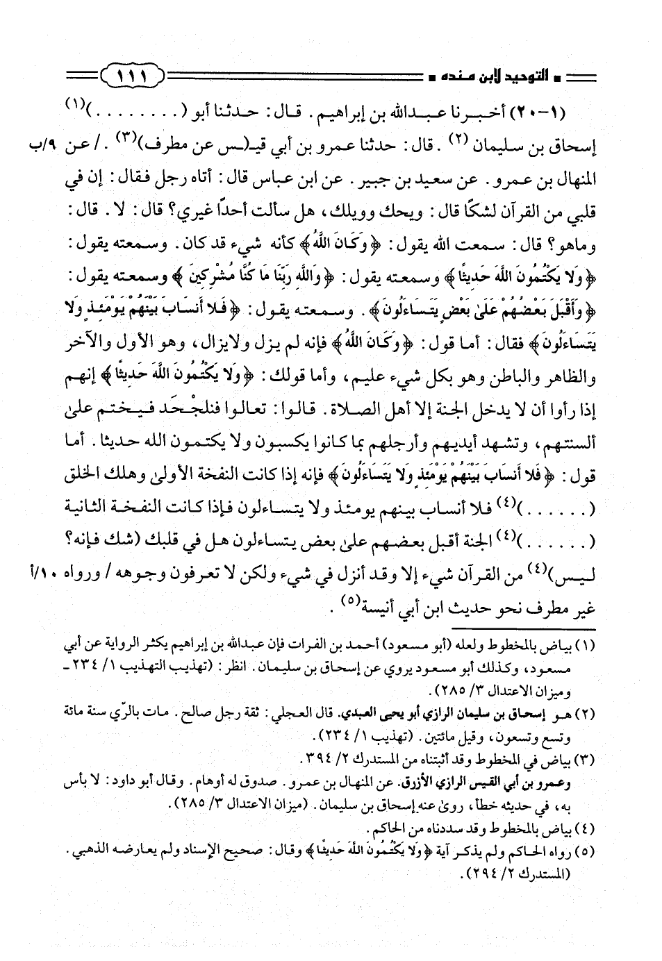 {وَأَقْبَلَ بَعْضُهُمْ عَلى بَعْضٍ يَتَساءَلُونَ}. وسمعته يقول: {فَلا أَنْسابَ بَيْنَهُمْ يَوْمَئِذٍ وَلا يَتَساءَلُونَ} فقال: أما قول: {وَكانَ اللهُ *} فإنه لم يزل ولايزال، وهو الأول والآخر والظاهر والباطن وهو بكل شئ عليم، وأما قولك: {وَلا يَكْتُمُونَ اللهَ حَدِيثاً} إنهم إذا رأوا أن لا يدخل الجنة إلا أهل الصلاة. قالوا: تعالوا فنلجْحَد فيختم على ألسنتهم، وتشهد أيديهم وأرجلهم بما كانوا يكسبون ولا يكتمون الله حديثا. أما قول: {فَلا أَنْسابَ بَيْنَهُمْ يَوْمَئِذٍ وَلا يَتَساءَلُونَ} فإنه إذا كانت النفخة الأولى وهلك الخلق ( .... ) (¬٤) فلا أنساب بينهم يومئذ ولا يتسألون فإذا كانت النفخة الثانية ( .... ) (¬٤) الجنة أقبل بعضهم على بعض يتسألون هل فى قلبك (شك فإنه؟ ليس) (¬٤) من القرآن شئ إلا وقد أنزل فى شئ ولكن لا تعرفون وجوهه/ورواه غير مطرف نحو حديث ابن أبى أنيسة (¬٥).