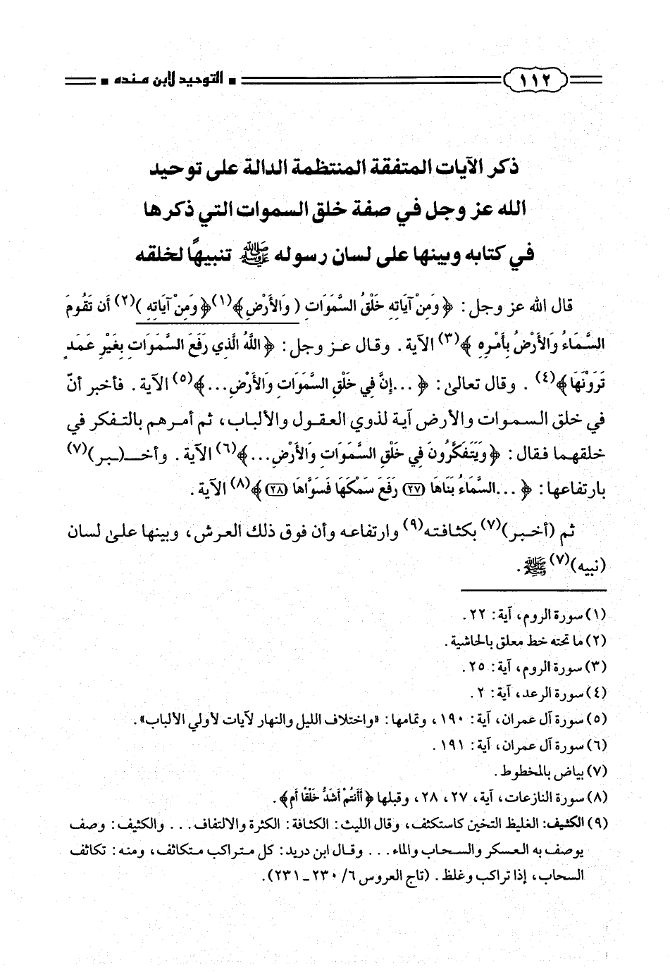 قال الله عز وجل: {وَمِنْ آياتِهِ خَلْقُ السَّماواتِ وَالْأَرْضِ} (¬١) {وَمِنْ آياتِهِ) ٢ أَنْ تَقُومَ السَّماءُ وَالْأَرْضُ بِأَمْرِهِ} (¬٣) الآية. وقال عز وجل: {اللهُ الَّذِي رَفَعَ السَّماواتِ بِغَيْرِ عَمَدٍ تَرَوْنَها} (¬٤). وقال تعالى: { ... إِنَّ فِي خَلْقِ السَّماواتِ وَالْأَرْضِ .. }. (¬٥) الآية. فأخبر أنّ فى خلق السموات والأرض آية لذوى العقول والألباب، ثم أمرهم بالتفكر فى خلقهما فقال: {وَيَتَفَكَّرُونَ فِي خَلْقِ السَّماواتِ وَالْأَرْضِ .. }. (¬٦) الآية .. وأخ (بر) (¬٧) بارتفاعها: { ... السَّماءُ بَناها (٢٧) رَفَعَ سَمْكَها فَسَوّاها (٢٨)} (¬٨) الآية.