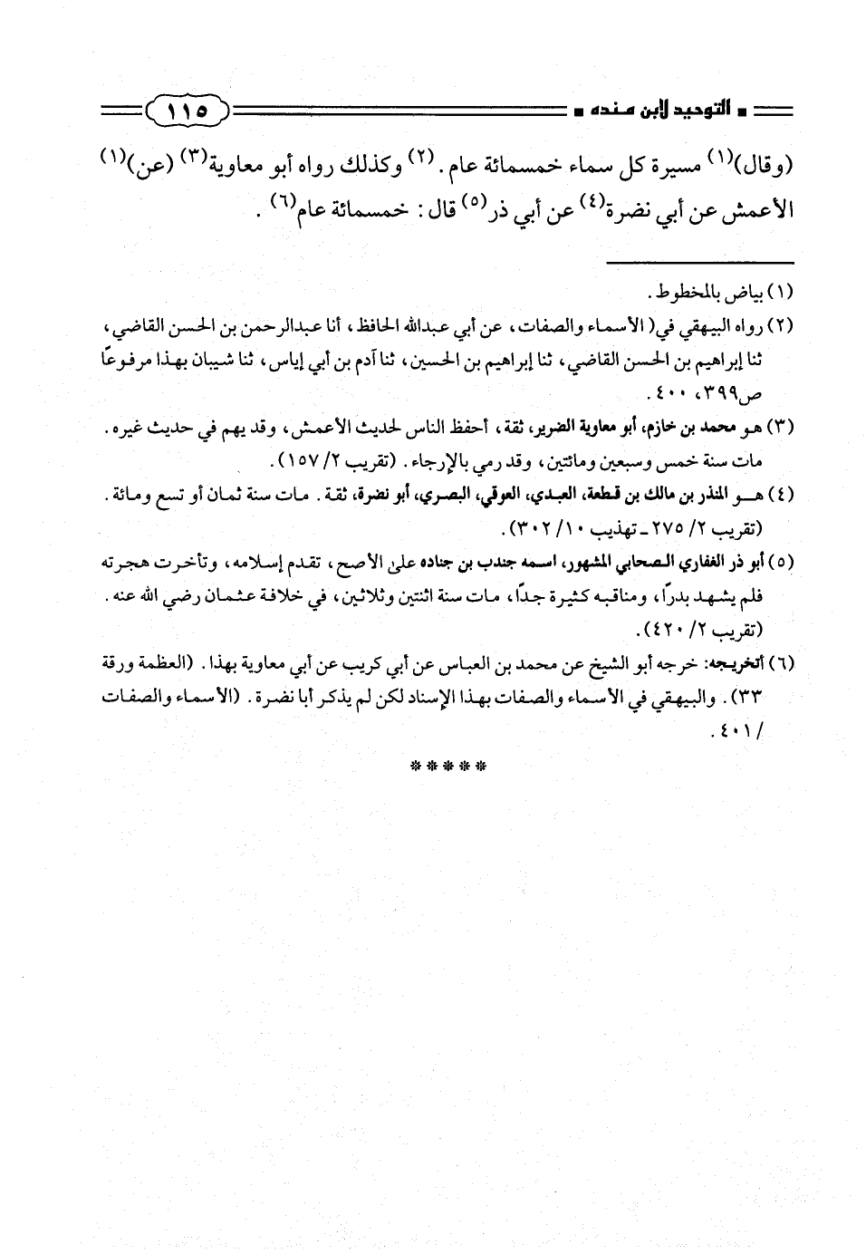 (وقال) (¬١) مسيرة كل سماء خمسمائة عام. (¬٢) وكذلك رواه أبو معاوية (¬٣) (عن) (¬١) الأعمش عن أبى نضرة (¬٤) عن أبى ذر (¬٥) قال: خمسمائة عام (¬٦).