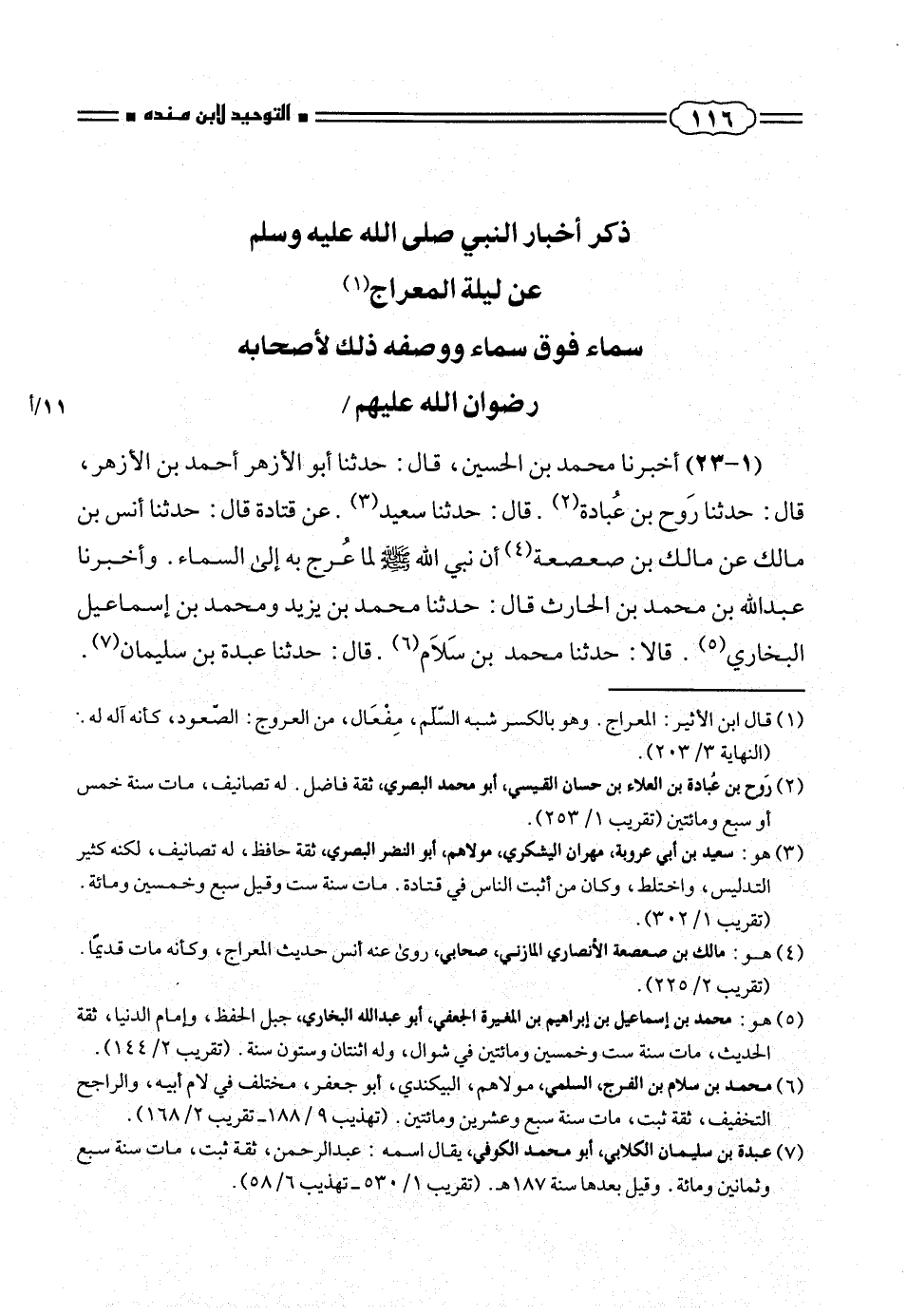 (١ - ٢٣) أخبرنا محمد بن الحسين، قال: حدثنا أبو الأزهر أحمد بن الأزهر، قال: حدثنا رَوح بن عُبادة (¬٢). قال: حدثنا سعيد (¬٣). عن قتادة قال: حدثنا أنس بن مالك عن مالك بن صعصعة (¬٤) أن نبى الله صلّى الله عليه وسلم لما عُرج به إلى السماء. وأخبرنا عبد الله بن محمد بن الحارث قال: حدثنا محمد بن يزيد ومحمد بن إسماعيل البخارى (¬٥). قالا: حدثنا محمد بن سَلام (¬٦). قال: حدثنا عبدة بن سليمان (¬٧).
