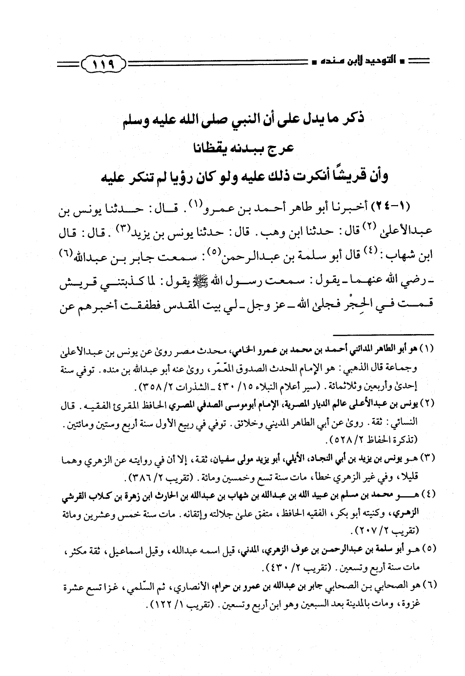 (١ - ٢٤) أخبرنا أبو طاهر أحمد بن عمرو (¬١). قال: حدثنا يونس بن عبد الأعلى (¬٢) قال: حدثنا ابن وهب. قال: حدثنا يونس بن يزيد (¬٣). قال: قال ابن شهاب: (¬٤) قال أبو سلمة بن عبد الرحمن (¬٥): سمعت جابر بن عبد الله (¬٦) - رضى الله عنهما - يقول: سمعت رسول الله صلّى الله عليه وسلم يقول: لما كذبتنى قريش قمت فى الحِجْر فجلى الله - عز وجل - لى بيت المقدس فطفقت أخبرهم عن