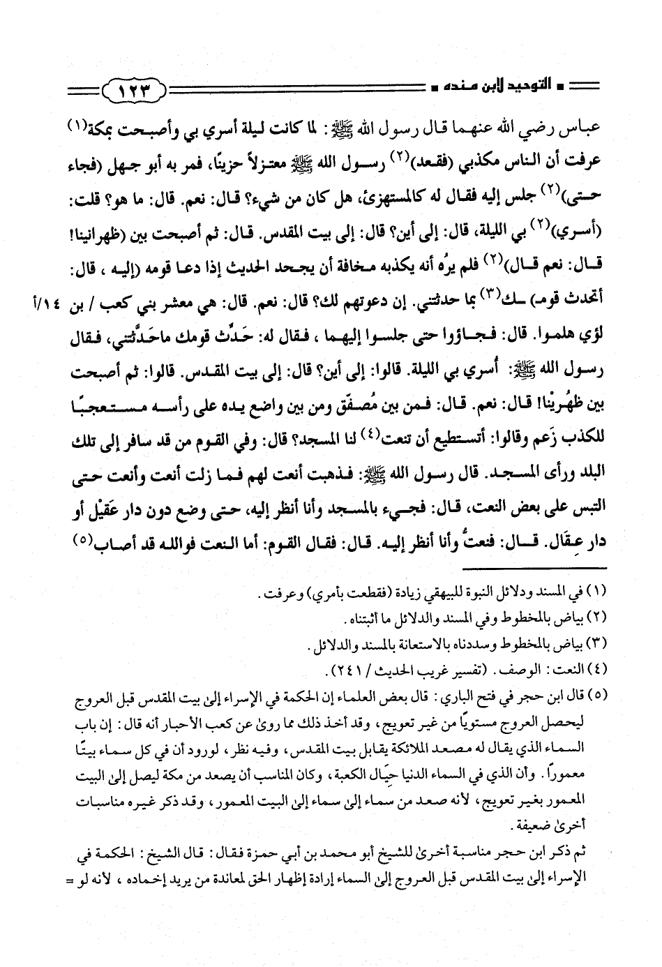 (¬٥) قال ابن حجر فى فتح البارى: قال بعض العلماء إن الحكمة فى الاسراء إلى بيت المقدس قبل العروج ليحصل العروج مستوياً من غير تعويج، وقد أخذ ذلك مما روى عن كعب الأحبار أنه قال: إن باب السماء الذى يقال له مصعد الملائكة يقابل بيت المقدس، وفيه نظر، لورود أن فى كل سماء بيتاً معموراً. وأن الذى فى السماء الدنيا حِيَال الكعبة، وكان المناسب أن يصعد من مكة ليصل إلى البيت المعمور بغير تعويج، لأنه صعد من سماء إلى سماء إلى البيت المعمور، وقد ذكر غيره مناسبات أخرى ضعيفة.