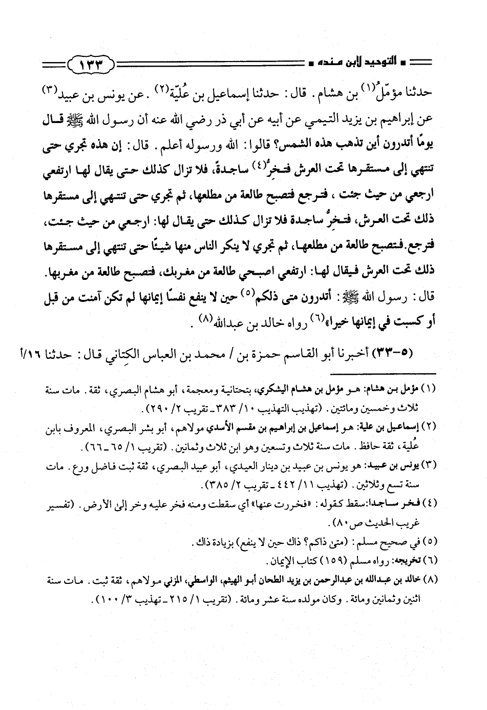 حدثنا مؤمّل (¬١) بن هشام. قال: حدثنا إسماعيل بن عَليّة (¬٢). عن يونس بن عبيد (¬٣) عن إبراهيم بن يزيد التيمى عن أبيه عن أبى ذر رضى الله عنه أن رسول الله صلّى الله عليه وسلم قال يوماً أتدرون أين تذهب هذه الشمس؟ قالوا: الله ورسوله أعلم. قال: إن هذه تجرى حتى تنتهى إلى مستقرها تحت العرش فتخِرُّ (¬٤) ساجدةً، فلا تزال كذلك حتى يقال لها ارتفعى ارجعى من حيث جئت، فترجع فتصبح طالعة من مطلعها، ثم تجرى حتى تنتهى إلى مستقرها ذلك تحت العرش، فتخِر ساجدة فلا تزال كذلك حتى يقال لها: ارجعى من حيث جئت، فترجع. فتصبح طالعة من مطلعها، ثم تجرى لا ينكر الناس منها شيئاً حتى تنتهى إلى مستقرها ذلك تحت العرش فيقال لها: ارتفعى اصبحى طالعة من مغربك، فتصبح طالعة من مغربها.
