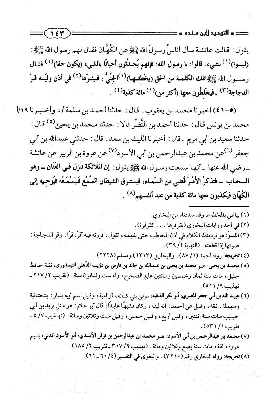 حدثنا سعيد بن أبى مريم. قال: أخبرنا الليث بن سعد. قال: حدثنى عبيدالله بن أبى جعفر (¬٦) عن محمد بن عبد الرحمن بن أبى الأسود (¬٧) عن عروة بن الزبير عن عائشة - رضى الله عنها - أنها سمعت رسول الله صلّى الله عليه وسلم يقول: إن الملائكة تنزل فى العَنَان - وهو السحاب - فتذكرُ الأمْرَ قضى من السماء، فيسترق الشيطان السّمع فَيَسْمَعُه فيُوحِيه إلى الكُهّان فيكذبون معها مائة كذبة من عند أنفسهم (¬٨).