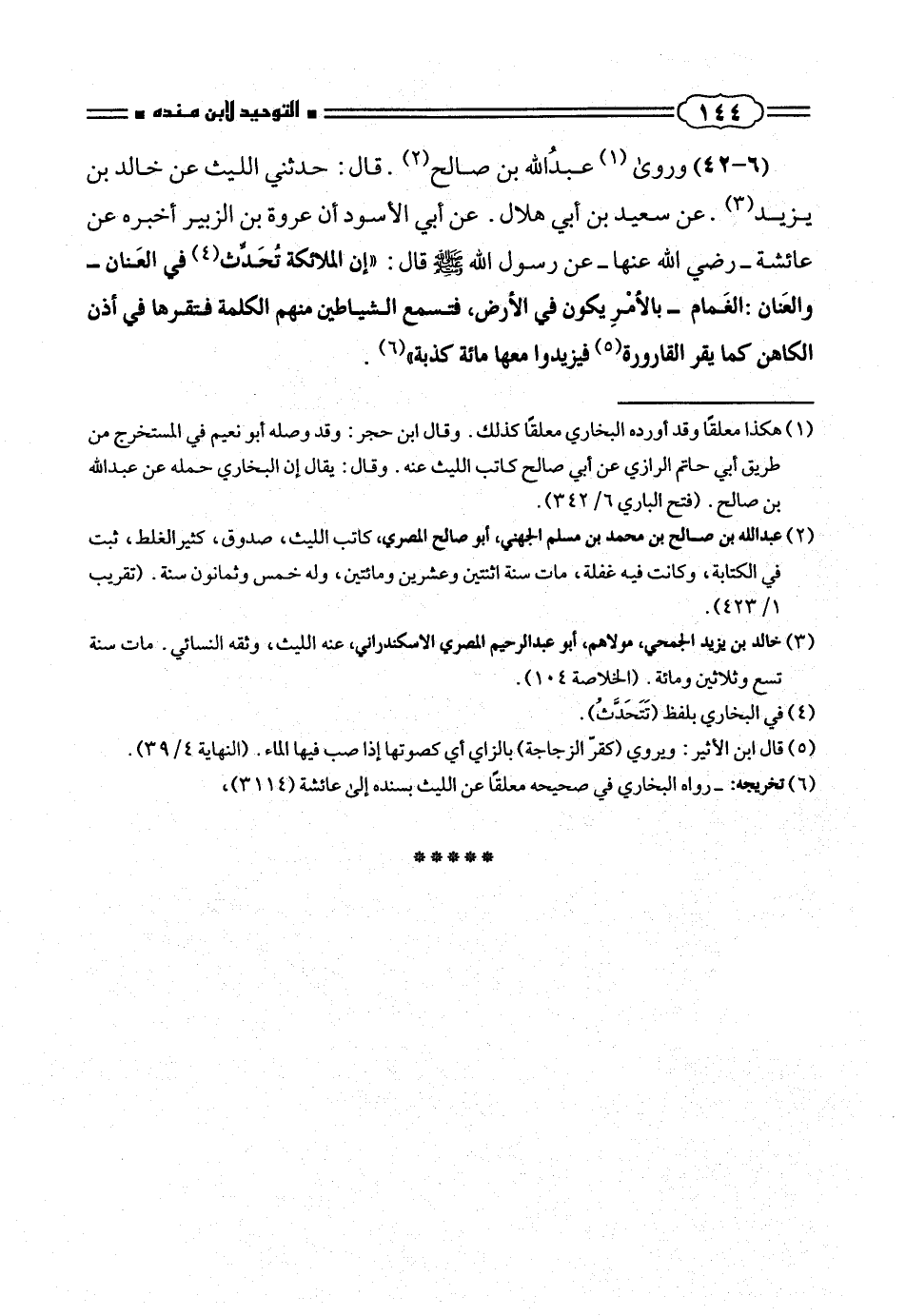(٦ - ٤٢) وروى (¬١) عبد الله بن صالح (¬٢). قال: حدثنى الليث عن خالد بن يزيد (¬٣). عن سعيد بن أبى هلال. عن أبى الأسود أن عروة بن الزبير أخبره عن عائشة - رضى الله عنها - عن رسول الله صلّى الله عليه وسلم قال: «إن الملائكة تُحَدِّث (¬٤) فى العنان - والعَنان: الغَمام - بالاُمْرِ يكون فى الأرض، فتسع الشياطين منهم الكلمة فتقرها فى أذن الكاهن كما يقر القارورة (¬٥) فيزيدوا معها مائة كذبة» (¬٦).