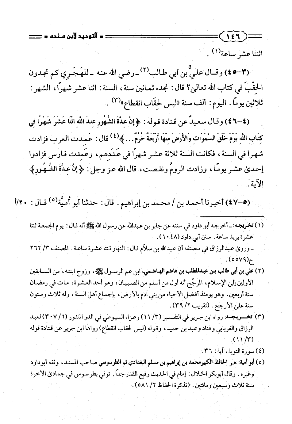 (٤ - ٤٦) وقال سعيدٌ عن قتادة قوله: {إِنَّ عِدَّةَ الشُّهُورِ عِنْدَ اللهِ اثْنا عَشَرَ شَهْراً فِي كِتابِ اللهِ يَوْمَ خَلَقَ السَّماواتِ وَالْأَرْضَ مِنْها أَرْبَعَةٌ حُرُمٌ .. }. (¬٤) قال: عَمِدت العرب فزادت شهرا فى السنة، فكانت السنة ثلاثة عشر شهراً فى عبددِهم، وعَمِدت فارس فزادوا إحدى عشر يوماً، وزادت الرومُ ونقصت، قال الله عز وجل: {إِنَّ عِدَّةَ الشُّهُورِ} الآية.