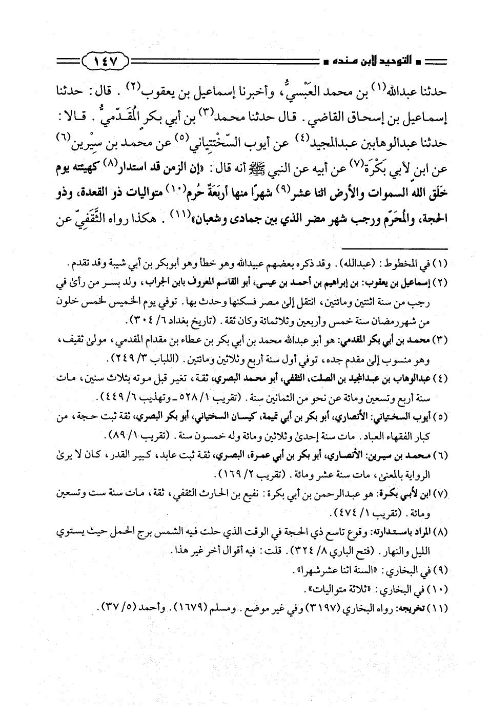 حدثنا عبد الوهاب بن عبد المجيد (¬٤) عن أيوب السّخْتتِيانى (¬٥) عن محمد بن سِيْرين (¬٦) عن ابن لأبى بَكْرَة (¬٧) عن أبيه عن النبى صلّى الله عليه وسلم أنه قال: «إن الزمن قد استدار (¬٨) كهيئته يوم خَلَق الله السموات والأرض اثنا عشر (¬٩) شهراً منها أربَعَة حُرم (¬١٠) متواليات ذو القعدة، وذو الحجة، والمحَرّم ورجب شهر مضر الذى بين جمادى وشعبان» (¬١١). هكذا رواه الثَّقَفِىّ عن