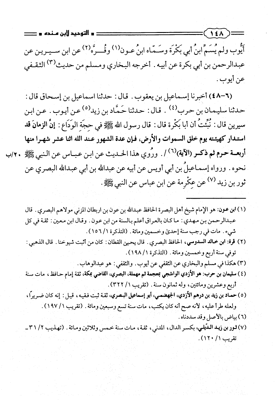 حدثنا سليمان بن حرب (¬٤). قال: حدثنا حَمّاد بن زيد (¬٥) عن أيوب. عن ابر سيرين قال: نُبِّئتُ أن أبا بَكْرة قال: قال رسول الله صلّى الله عليه وسلم فى حِجَةِ الوَدَاع: إنَّ الزمانَ قد استدار كهيئته يوم خلق السموات والأرض، فإن عدة الشهور عند الله اثنا عشر شهرا منها أربعة حرم ثم ذكر (الآية) (¬٦) /. ورُوى هذا الحديث عن ابن عباس عن النبى صلّى الله عليه وسلم نحوه. ورواه إسماعيلُ بن أبى أويس عن أبيه عن عبد الله بن أبى عبد الله البصرى عز ثور بن زيد (¬٧) عن عِكْرِمة عن ابن عباس عن النبى صلّى الله عليه وسلم.