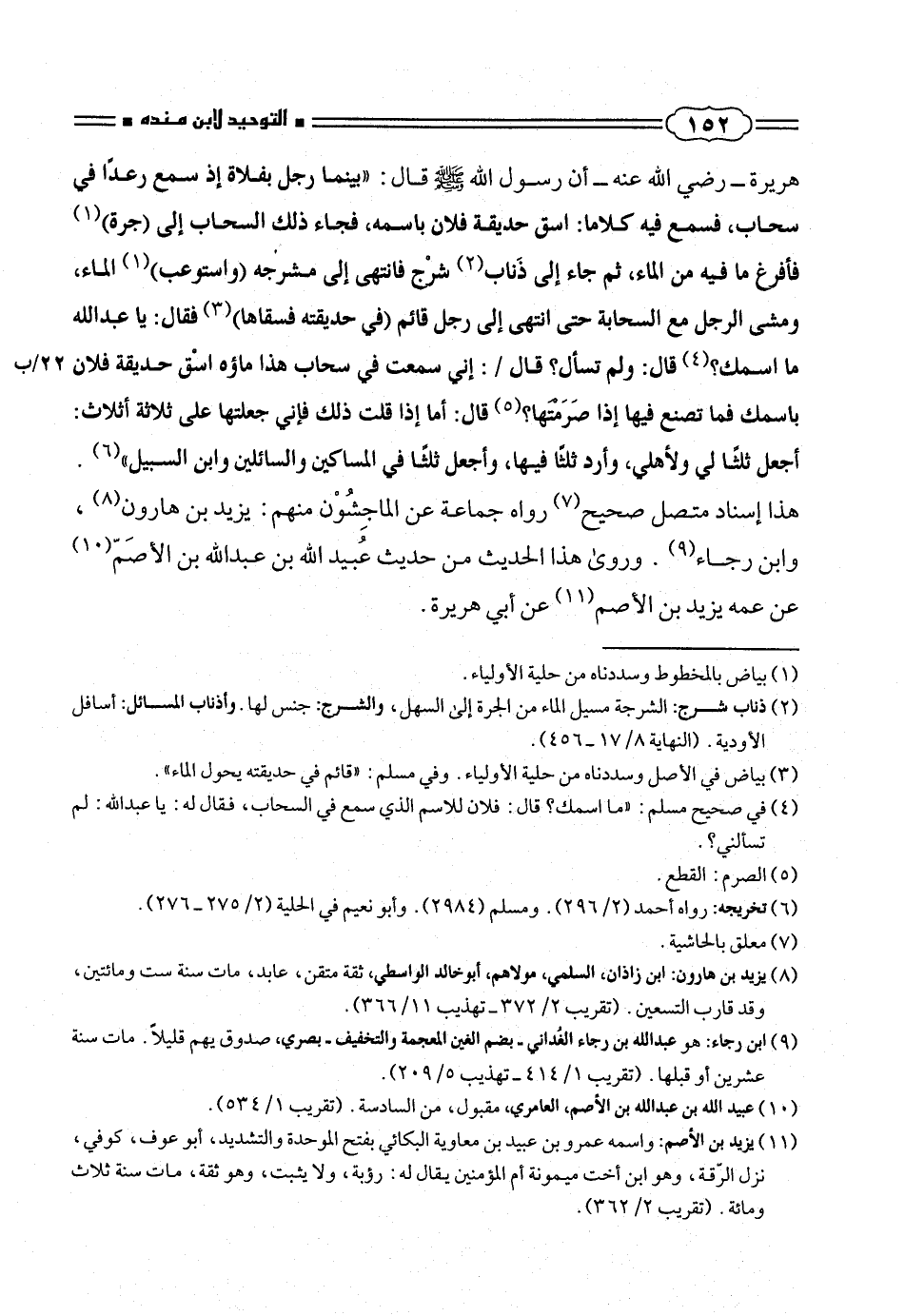 هريرة - رضى الله عنه - أن رسول الله صلّى الله عليه وسلم قال: «بينما رجل بفلاة إذ سمع رعداً فى سحاب، فسمع فيه كلاما: اسق حديقة فلان باسمه، فجاء ذلك السحاب إلى (جرة) (¬١) فأفرغ ما فيه من الماء، ثم جاء إلى ذَناب (¬٢) شرج فانتهى إلى مشرجه (واستوعب) (¬١) الماء، ومشى الرجل مع السحابة حتى انتهى إلى رجل قائم (فى حديقته فسقاها) (¬٣) فقال: يا عبد الله ما اسمك؟ (¬٤) قال: ولم تسأل؟ قال/: إنى سمعت فى سحاب هذا ماؤه اسْق حديقة فلان باسمك فما تصنع فيها إذا صَرَمتها؟ (¬٥) قال: أما إذا قلت ذلك فإنى جعلتها على ثلاثة أثلاث: