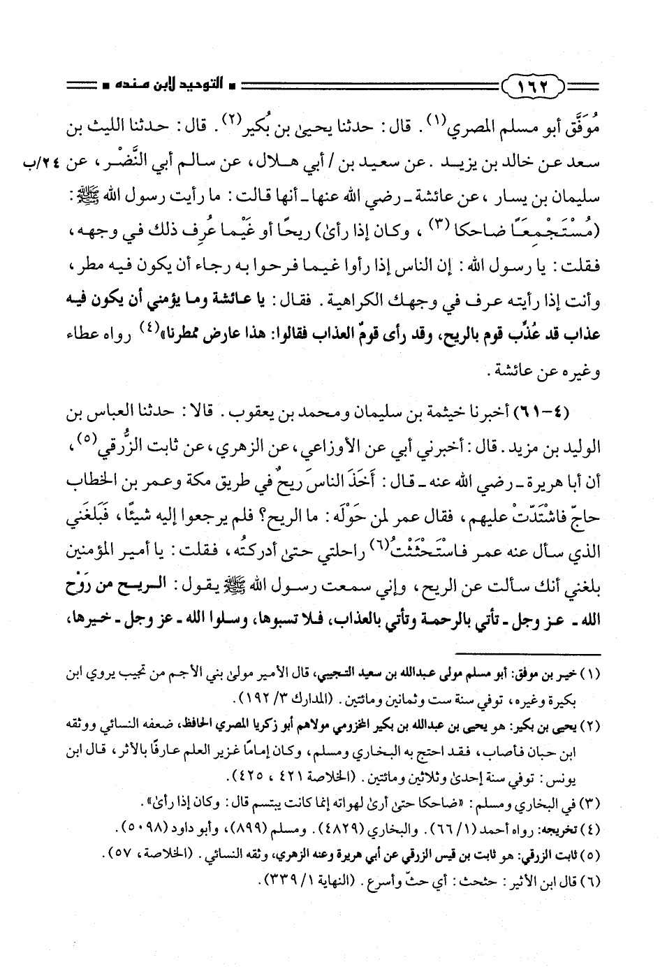 (٤ - ٦١) أخبرنا خيثمة بن سليمان ومحمد بن يعقوب. قالا: حدثنا العباس بن الوليد بن مزيد. قال: أخبرنى أبى عن الأوزاعى، عن الزهرى، عن ثابت الزُّرقى (¬٥)، أن أبا هريرة - رضى الله عنه - قال: أَخَذَ الناسَ ريح فى طريق مكة وعمر بن الخطاب حاجّ فاشْتَدّتْ عليهم، فقال عمر لمن حَوْلَه: ما الريح؟ فلم يرجعوا إليه شيئاً، فَبَلغَنى الذى سأل عنه عمر فاسْتَحْثَثْتُ (¬٦) راحلتى حتى أدركتُه، فقلت: يا أمير المؤمنين بلغنى أنك سألت عن الريح، وإنى سمعت رسول الله صلّى الله عليه وسلم يقول: الريح من رَوْح الله - عز وجل - تأتى بالرحمة وتأتى بالعذاب، فلا تسبوها، وسلوا الله - عز وجل - خيرها،