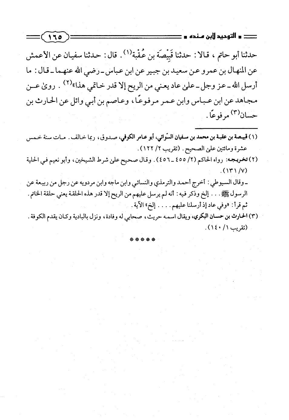 حدثنا أبو حاتم، قالا: حدثنا قَبِيْصَة بن عُقْبة (¬١). قال: حدثنا سفيان عن الأعمش عن المنهال بن عمرو عن سعيد بن جبير عن ابن عباس - رضى الله عنهما - قال: ما أرسل الله - عز وجل - على عاد يعنى من الريح إلا قدر خاتمى هذا» (¬٢). روى عن مجاهد عن ابن عباس وابن عمر مرفوعاً، وعاصم بن أبى وائل عن الحارث بن حسان (¬٣) مرفوعاً.