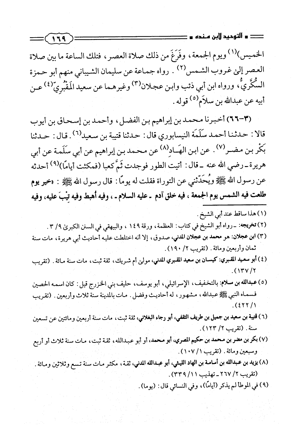 (٣ - ٦٦) أخبرنا محمد بن إبراهيم بن الفضل، وأحمد بن إسحاق بن أيوب قالا: حدثنا أحمد سَلَمَة النيسابورى قال: حدثنا قتيبة بن سعيد (¬٦). قال: حدثنا بَكْر بن مضر (¬٧). عن ابن الهَادِ (¬٨) عن محمد بن إبراهيم عن أبى سَلَمة عن أبى هريرة - رضى الله عنه - قال: أتيت الطور فوجدت ثَمَّ كعبا (فمكثت أياماً) (¬٩) أحدثه عن رسول الله صلّى الله عليه وسلم ويُحَدّثنى عن التوراة فقلت له يوماً: قال رسول الله صلّى الله عليه وسلم: «خير يوم طلعت فيه الشمس يوم الجمعة، فيه خلق آدم - عليه السلام -، وفيه أهبط وفيه تِيبَ عليه، وفيه