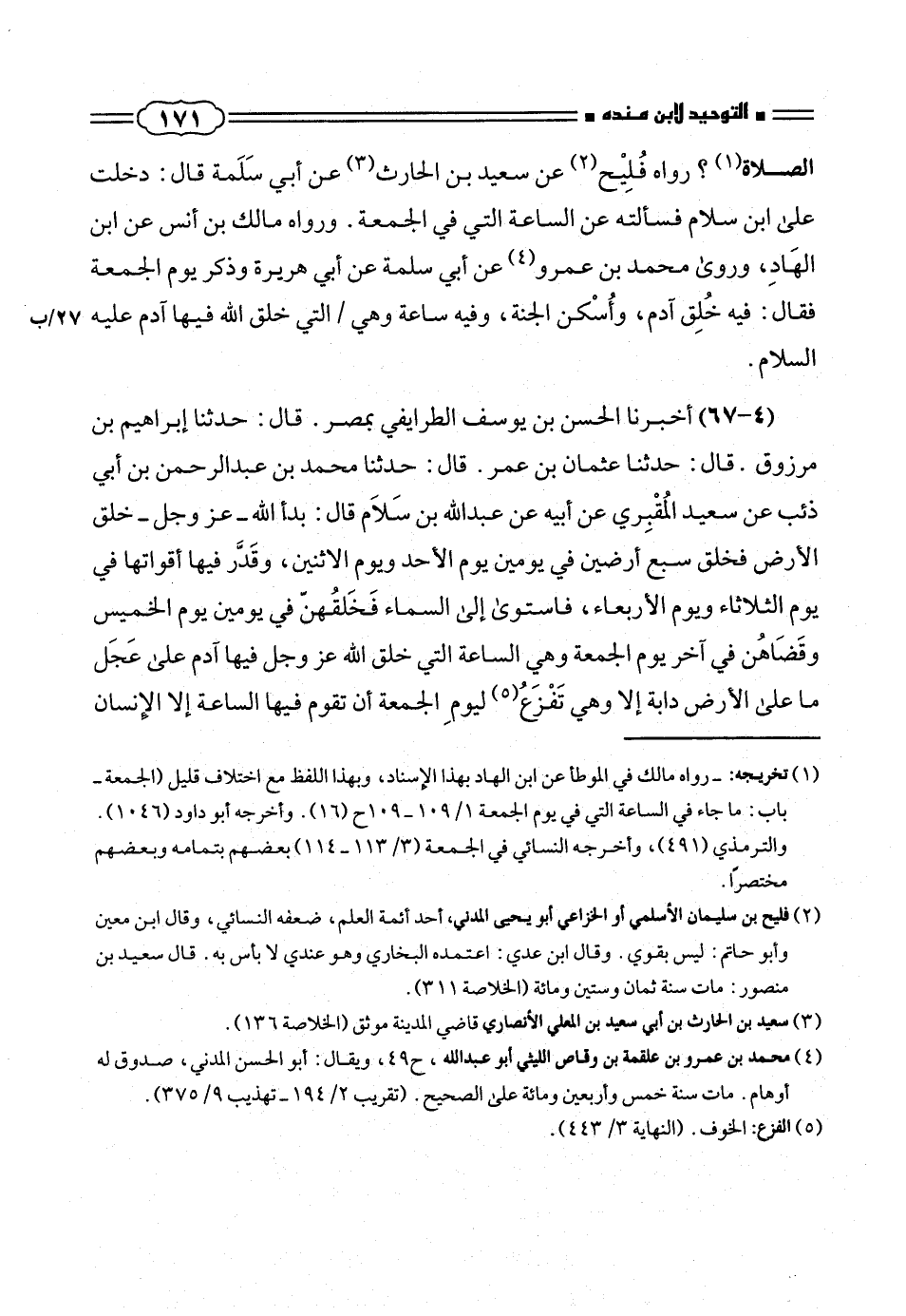 (٤ - ٦٧) أخبرنا الحسن بن يوسف الطرايفى بمصر. قال: حدثنا إبراهيم بن مرزوق. قال: حدثنا عثمان بن عمر. قال: حدثنا محمد بن عبد الرحمن بن أبى ذئب عن سعيد المُقْبِرى عن أبيه عن عبد الله بن سَلام قال: بدأ الله - عز وجل - خلق الأرض فخلق سبع أرضين فى يومين يوم الأحد ويوم الاثنين، وقَدَّر فيها أقواتها فى يوم الثلاثاء ويوم الأربعاء، فاستوى إلى السماء فَخَلقُهنّ فى يومين يوم الخميس وقَضَاهُن فى آخر يوم الجمعة وهى الساعة التى خلق الله عز وجل فيها ادم على عَجَل ما على الأرض دابة إلا وهى تَفْزعُ (¬٥) ليومِ الجمعة أن تقوم فيها الساعة إلا الإنسان