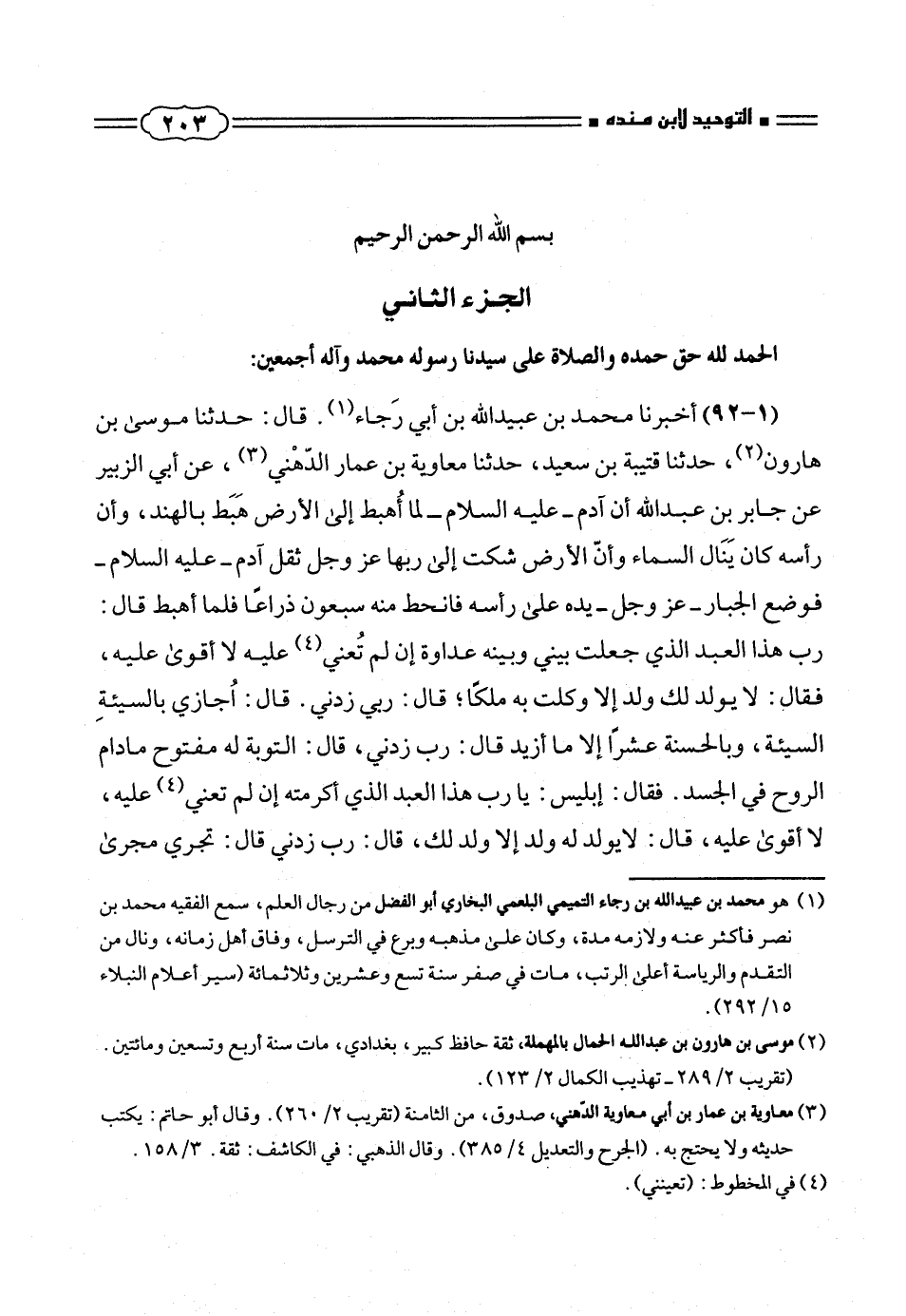 (١ - ٩٢) أخبرنا محمد بن عبيدالله بن أبى رَجاء (¬١). قال: حدثنا موسى بن هارون (¬٢)، حدثنا قتيبة بن سعيد، حدثنا معاوية بن عمار الدّهْنى (¬٣)، عن أبى الزبير عن جابر بن عبد الله أن آدم - عليه السلام - لما أُهبط إلى الأرض هَبَط بالهند، وأن رأسه كان ينَال السماء وأنّ الأرض شكت إلى ربها عز وجل ثقل آدم - عليه السلام - فوضع الجبار - عز وجل - يده على رأسه فانحط منه سبعون ذراعاً فلما أهبط قال: