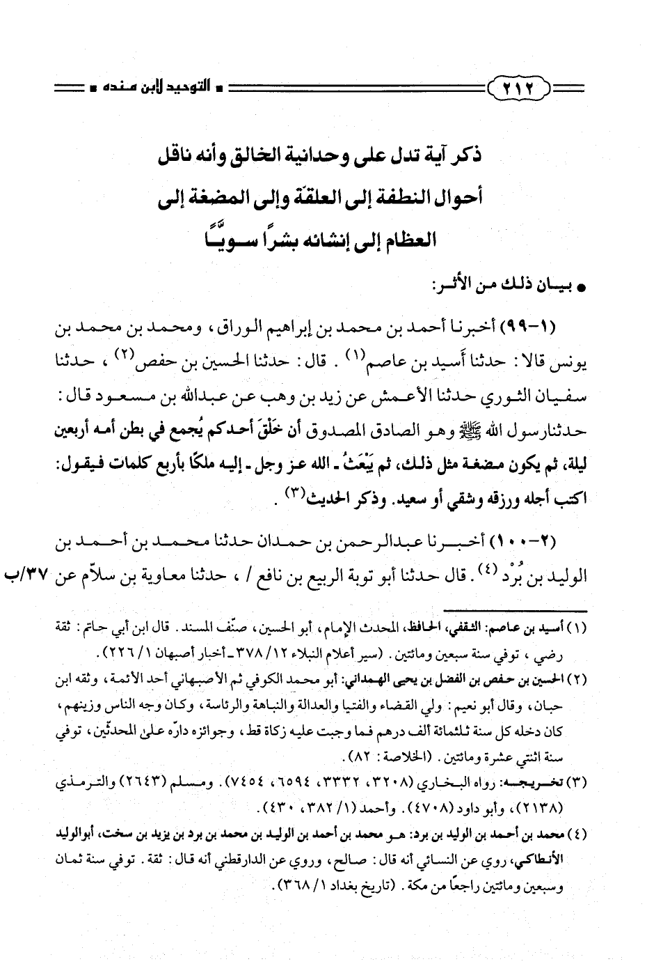 حدثنارسول الله صلّى الله عليه وسلم وهو الصادق المصدوق أن خَلْقَ أحدكم يجمع فى بطن أمه أربعين ليلة، ثم يكون مضغة مثل ذلك، ثم يبْعَثُ - الله عز وجل - إليه ملكاً بأربع كلمات فيقول: