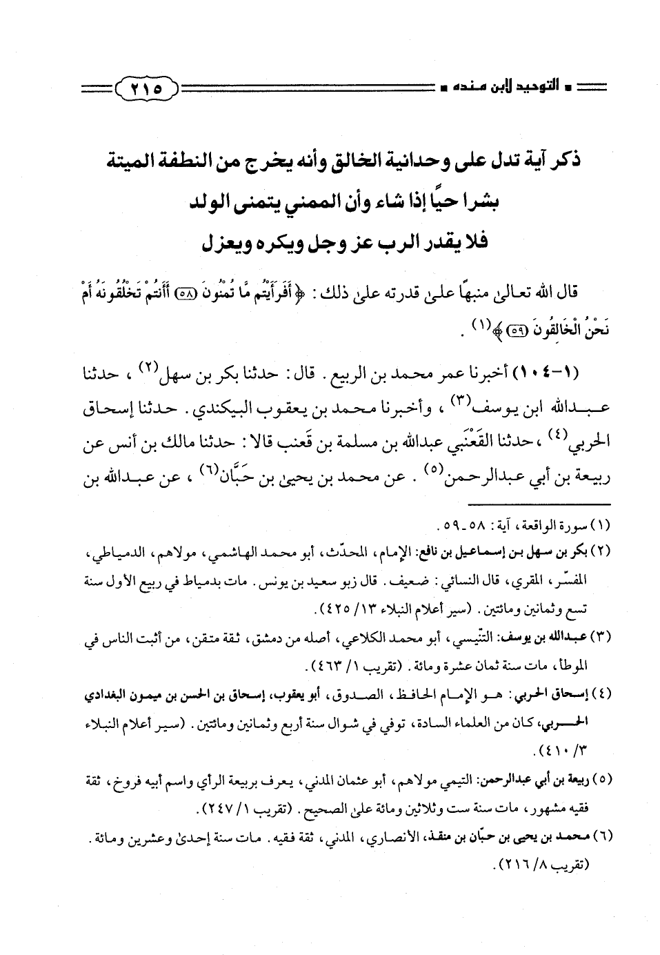 (١ - ١٠٤) أخبرنا عمر محمد بن الربيع. قال: حدثنا بكر بن سهل (¬٢)، حدثنا عبد الله ابن يوسف (¬٣)، وأخبرنا محمد بن يعقوب البيكندى. حدثنا إسحاق الحربى (¬٤)، حدثنا القَعْنَبى عبد الله بن مسلمة بن قَعنب قالا: حدثنا مالك بن أنس عن ربيعة بن أبى عبد الرحمن (¬٥) - عن محمد بن يحيى بن حَبَّان (¬٦)، عن عبد الله بن
