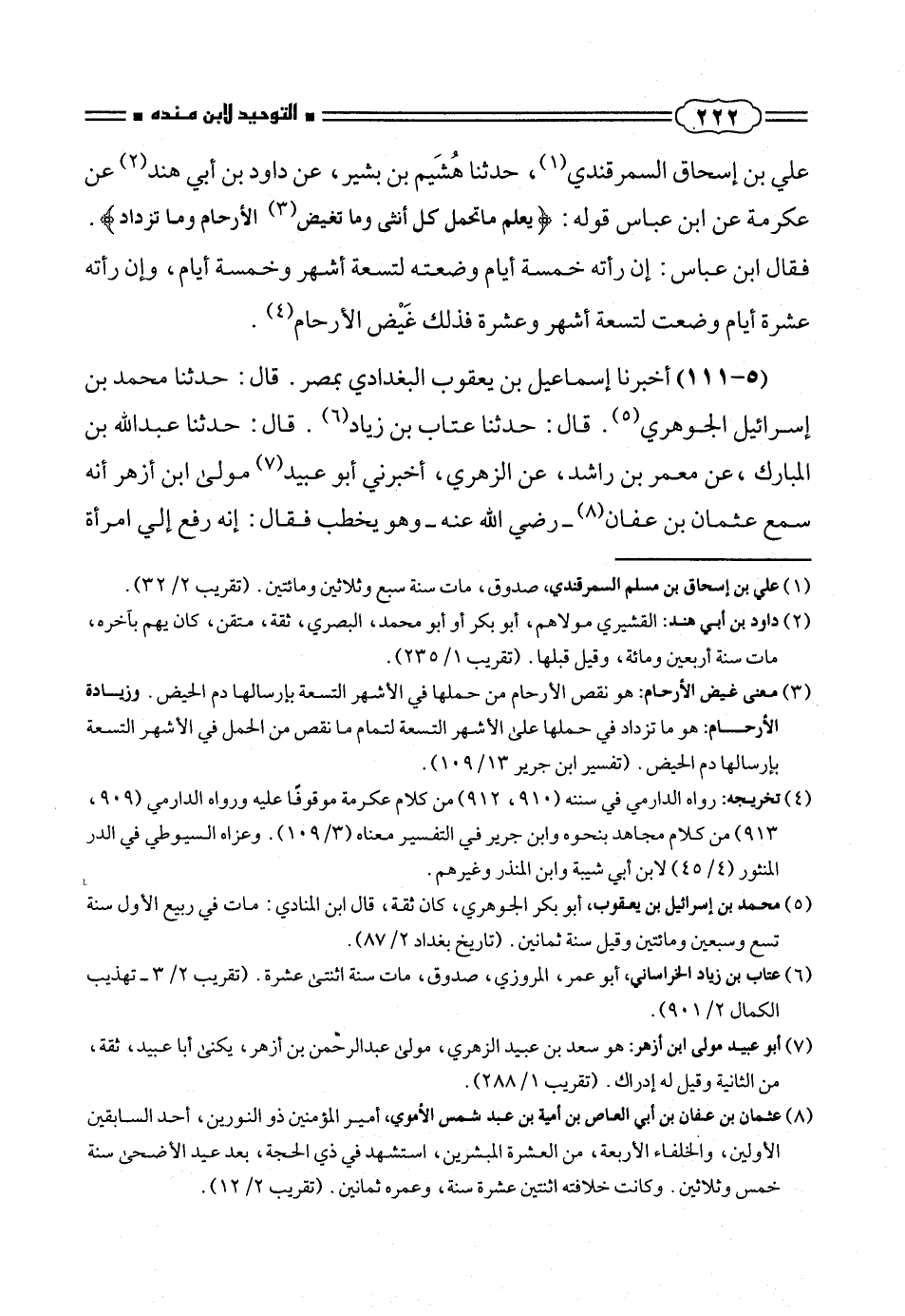 على بن إسحاق السمرقندى (¬١)، حدثنا هُشَيم بن بشير، عن داود بن أبى هند (¬٢) عن عكرمة عن ابن عباس قوله: {يَعْلَمُ ما تَحْمِلُ كُلُّ أُنْثى وَما تَغِيضُ ٣ الْأَرْحامُ وَما تَزْدادُ}.