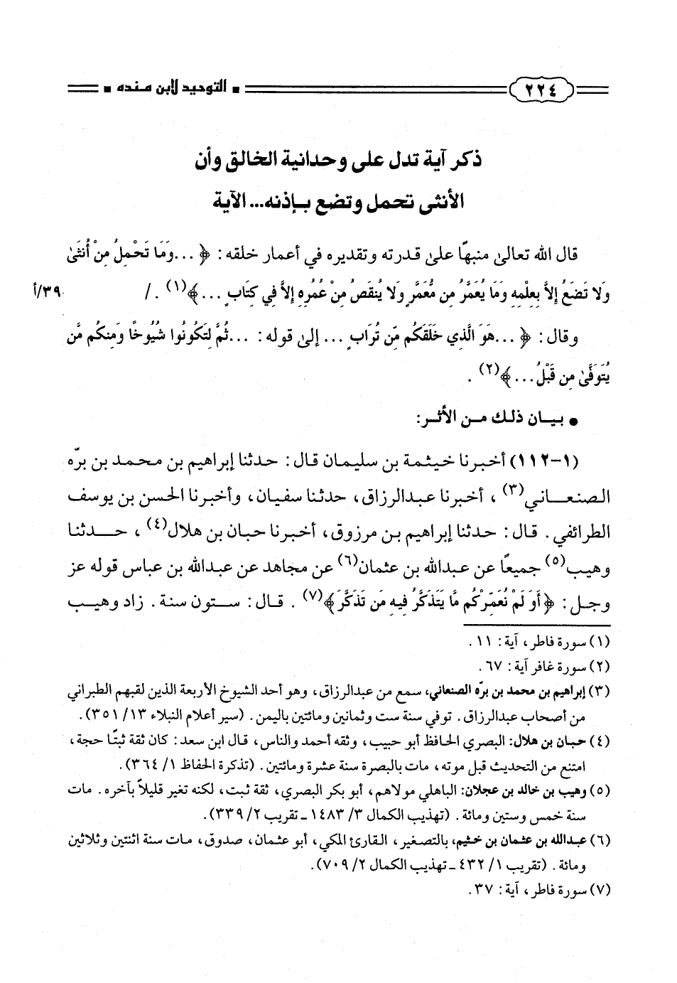 (١ - ١١٢) أخبرنا خيثمة بن سليمان قال: حدثنا إبراهيم بن محمد بن برّه الصنعانى (¬٣)، أخبرنا عبد الرزاق، حدثنا سفيان، وأخبرنا الحسن بن يوسف الطرائفى. قال: حدثنا إبراهيم بن مرزوق، أخبرنا حبان بن هلال (¬٤)، حدثنا (¬٥) حميعاً عن عبد الله بن عثمان (¬٦) عن محاهد عن عبد الله بن عباس قوله عز وهيب ..