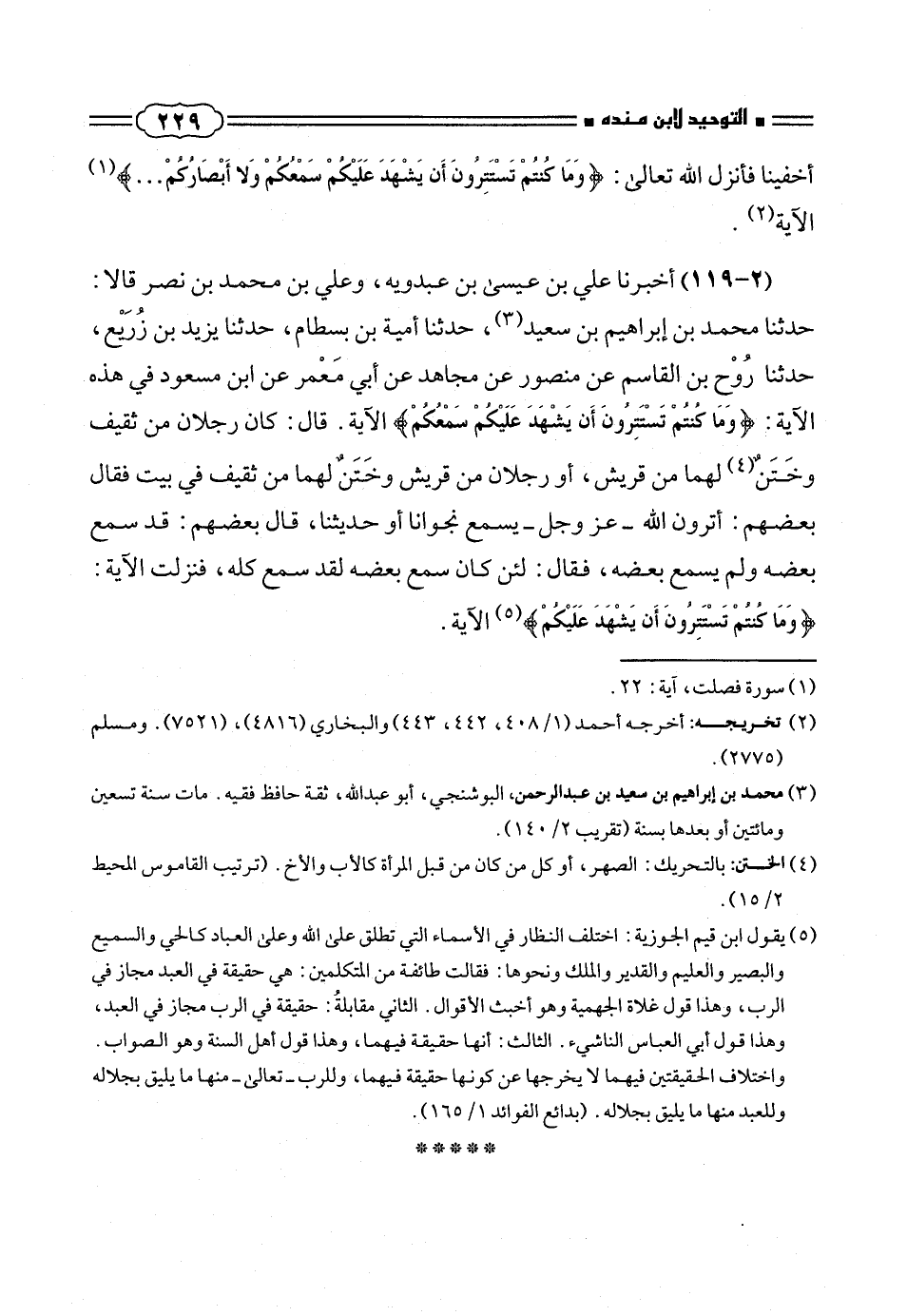 حدثنا محمد بن إبراهيم بن سعيد (¬٣)، حدثنا أمية بن بسطام، حدثنا يزيد بن زُرَيْع، حدثنا رُوْح بن القاسم عن منصور عن مجاهد عن أبى مَعْمر عن ابن مسعود فى هذه الآية: {وَما كُنْتُمْ تَسْتَتِرُونَ أَنْ يَشْهَدَ عَلَيْكُمْ سَمْعُكُمْ} الآية. قال: كان رجلان من ثقيف وختن (¬٤) لهما من قريش، أو رجلان من قريش وختن لهما من ثقيف فى بيت فقال بعضهم: أترون الله - عز وجل - يسمع نجوانا أو حديثنا، قال بعضهم: قد سمع بعضه ولم يسمع بعضه، فقال: لئن كان سمع بعضه لقد سمع كله، فنزلت الآية: