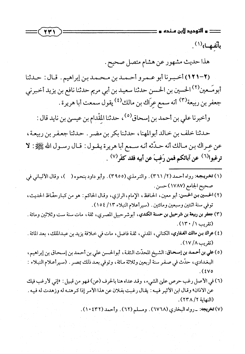 حدثنا خلف بن خالد أبوالمهنا، حدثنا بكر بن مضر. حدثنا جعفر بن ربيعة، عن عِراك بن مالك أنه حدّثه أنه سمع أبا هريرة يقول: قال رسول الله صلّى الله عليه وسلم: لا ترغبوا (¬٦) عن آبائكم فمن رَغِبَ عن أبيه فقد كفَر (¬٧).