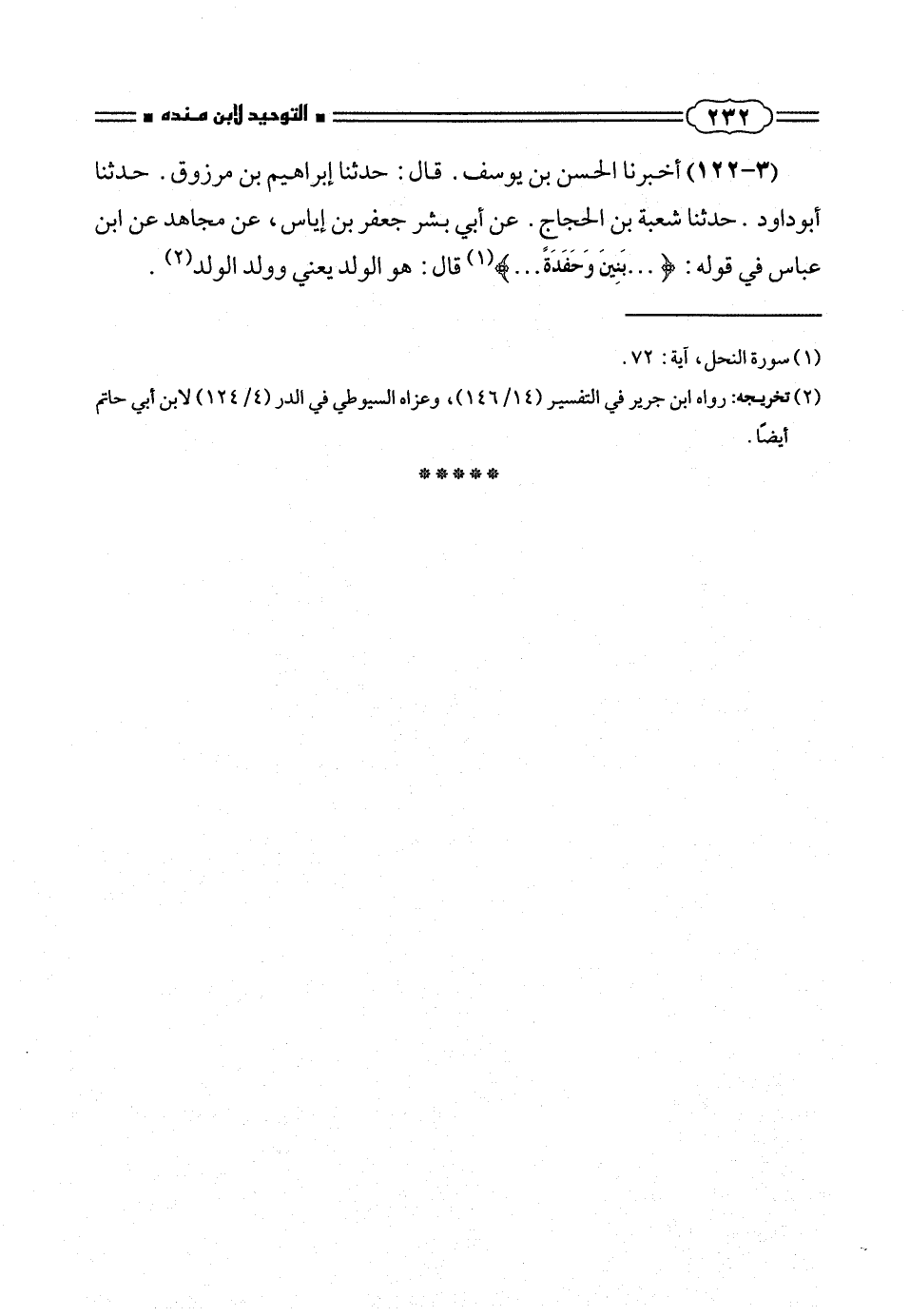 (٣ - ١٢٢) أخبرنا الحسن بن يوسف. قال: حدثنا إبراهيم بن مرزوق. حدثنا أبوداود. حدثنا شعبة بن الحجاج. عن أبى بشر جعفر بن إياس، عن مجاهد عن ابن عباس فى قوله: { ... بَنِينَ وَحَفَدَةً .. }. (¬١) قال: هو الولد يعنى وولد الولد (¬٢).