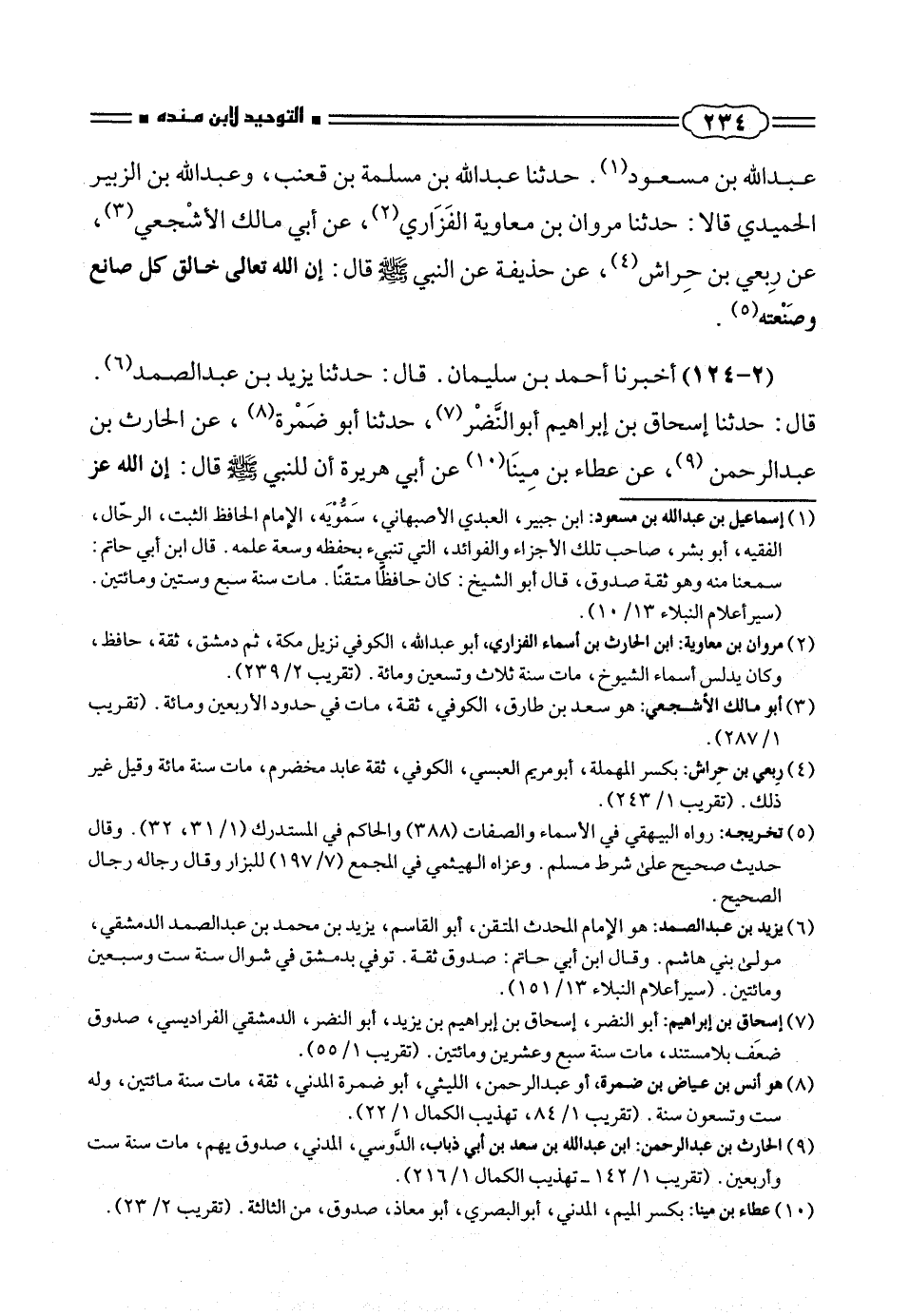 عبد الله بن مسعود (¬١). حدثنا عبد الله بن مسلمة بن قعنب، وعبدالله بن الزبير الحميدى قالا: حدثنا مروان بن معاوية الفَزَارى (¬٢)، عن أبى مالك الأشْجعى (¬٣)، عن رِبعى بن حِراش (¬٤)، عن حذيفة عن النبى صلّى الله عليه وسلم قال: إن الله تعالى خالق كل صانع وصَنْعته (¬٥).