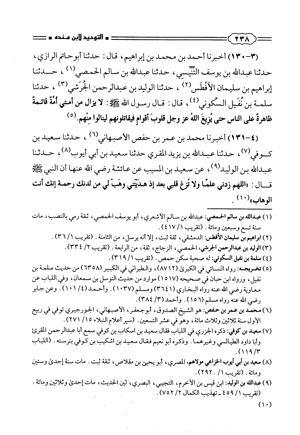 (٤ - ١٣١) أخبرنا محمد بن عمر بن حفص الأصبهانى (¬٦)، حدثنا سعيد بن كوفى (¬٧)، حدثنا عبد الله بن يزيد المقرى حدثنا سعيد بن أبى أيوب (¬٨)، حدثنا عبد الله بن الوليد (¬٩)، عن سعيد بن المسيب عن عائشة رضى الله عنها أن النبى صلّى الله عليه وسلم قال: «اللهم زدنى علماً ولا تُزغ قلبى بعد إذ هدَيتنى وهَبْ لى من لدنك رحمة إنك أنت الوهاب» (¬١٠).